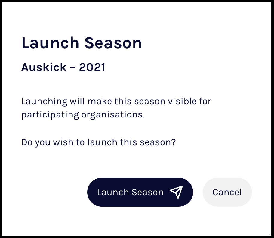 Launching a season is the process of making the season visible to participating organisations, allowing them to configure registration forms and allows participants to register for the season.