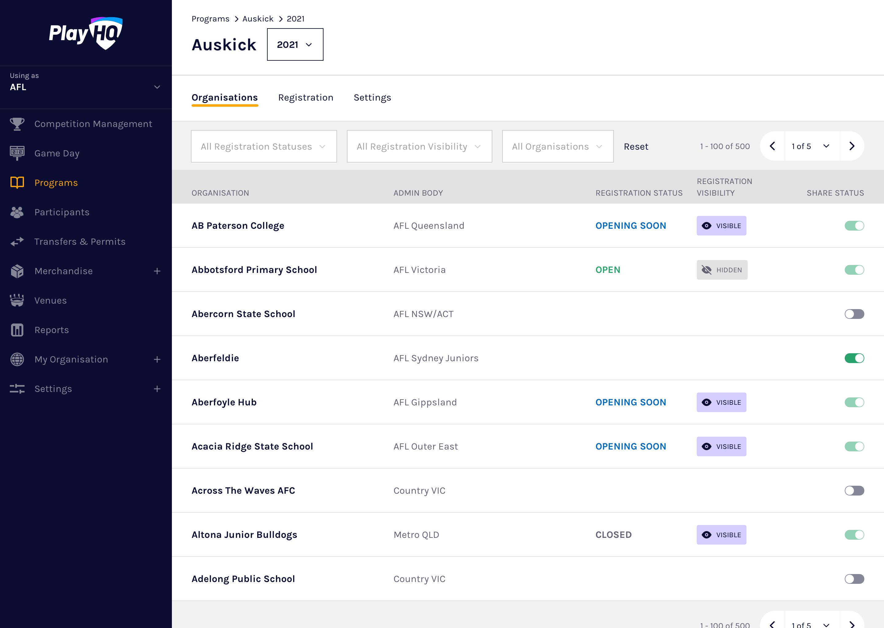 Before launching a shared program season, ensure that you have configured your participant to season registration settings and have shared the season with at least one organisation.
