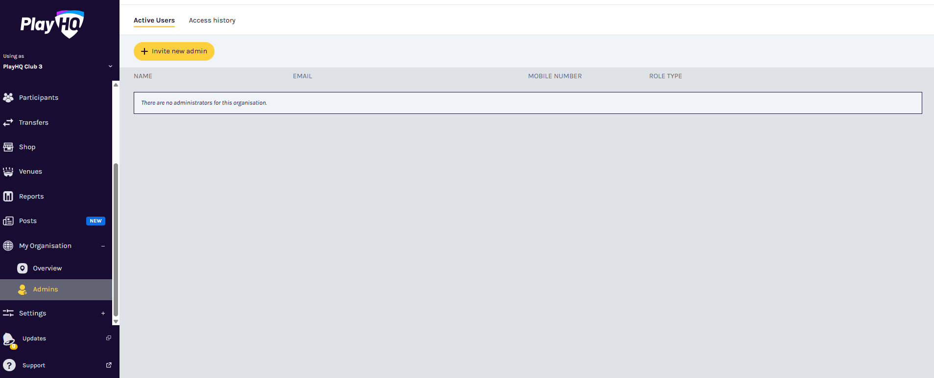 PlayHQ administrators can manage various functions in their organisation using the PlayHQ Admin Portal. Existing administrators with appropriate permissions can invite additional people to help manage the organisation and remove access when needed.