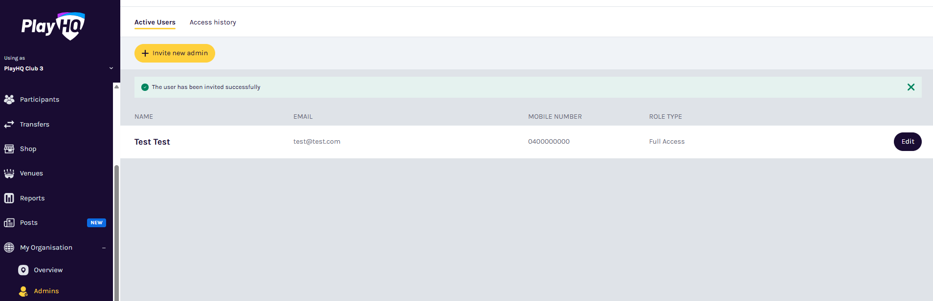 If you invite someone who is already an administrator for another organisation in PlayHQ: