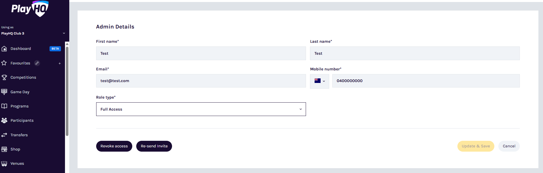 For more detailed information about administrator roles and their permissions, see Introduction to the PlayHQ Admin Portal.