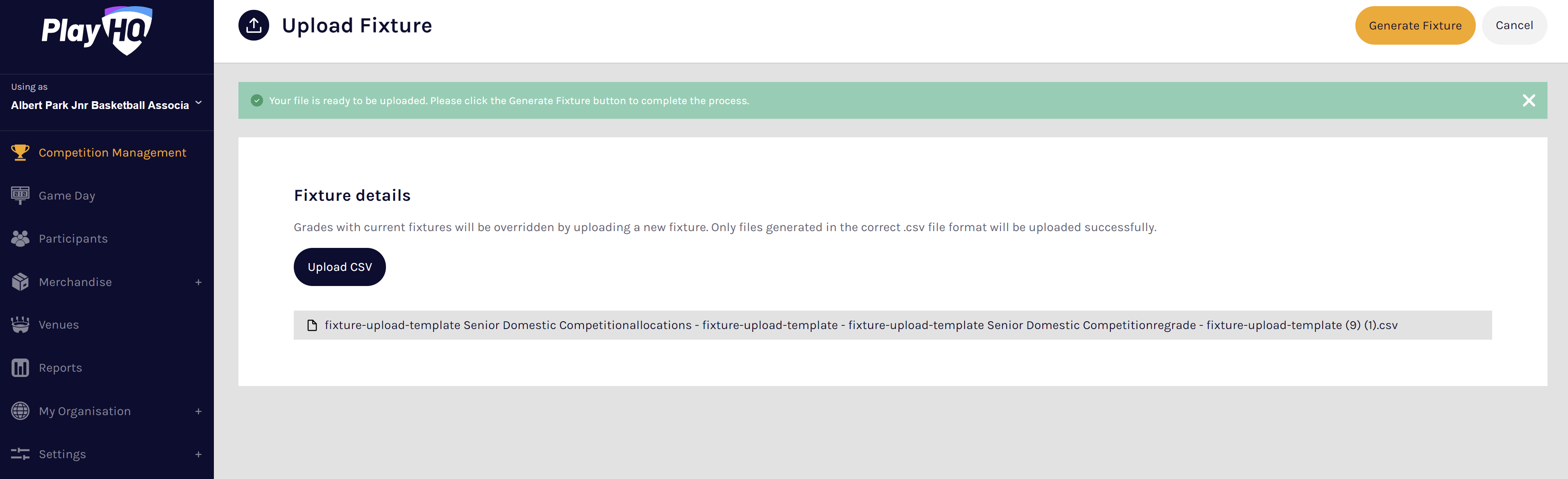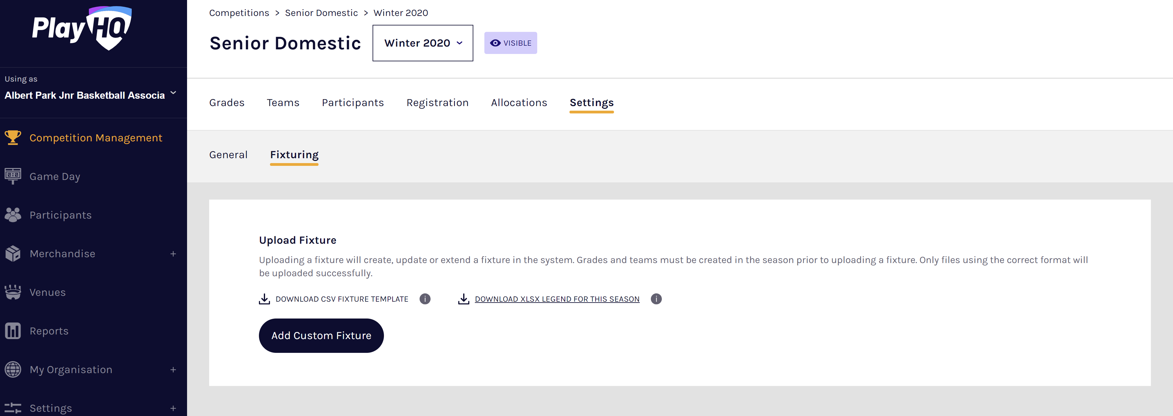 Note: The Fixture upload feature is disabled for Tournament style competitions due to the added complexity of this style of play. Additionally, if you use the fixture upload feature, the PlayHQ Regrade wizard will be disabled for the corresponding competition season. Regrading is then accomplished via the fixture upload.