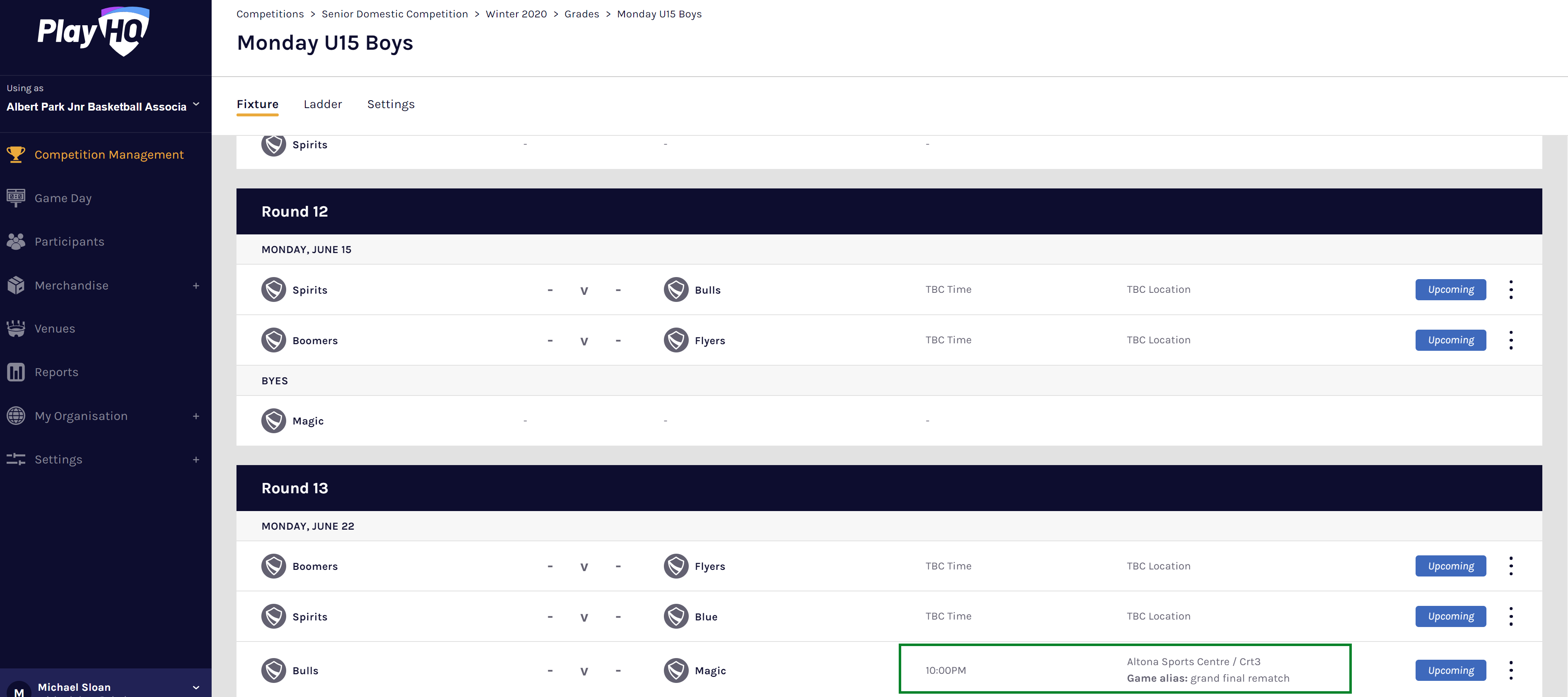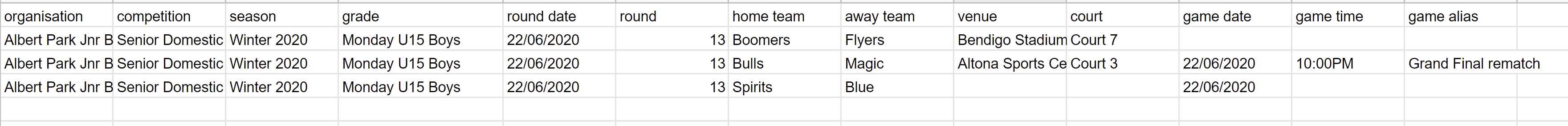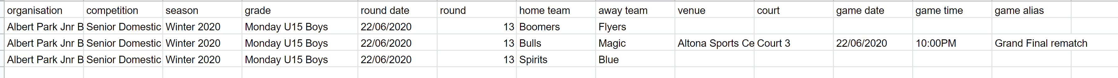 Along with fixturing a grade with the fixture upload feature, you can also allocate games to a venue, court, and specify game times.