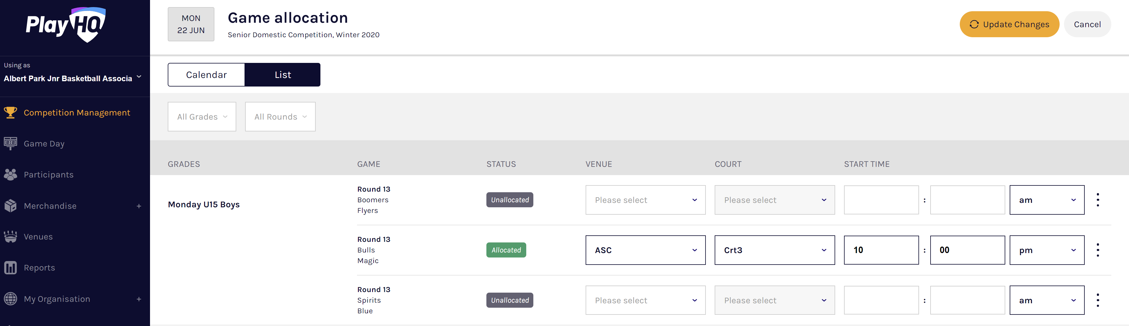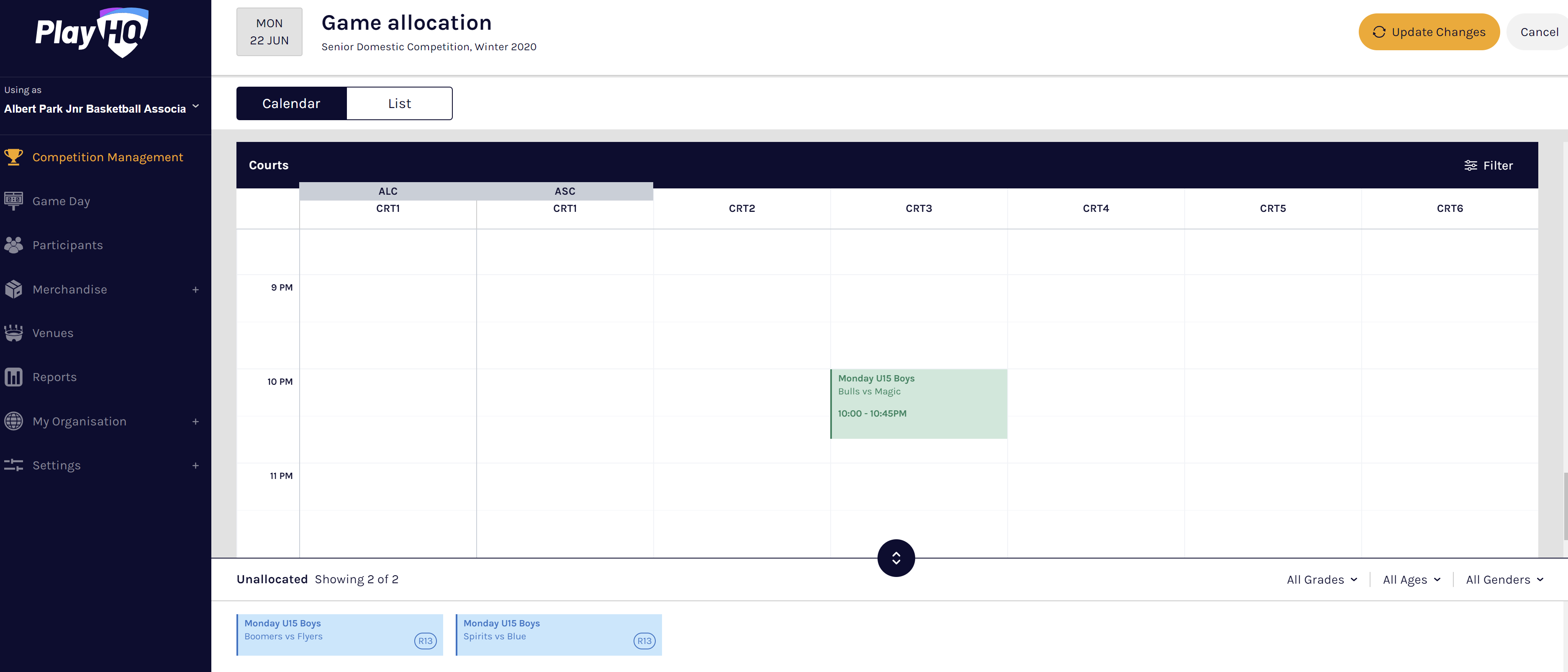 When you view the allocations and calendar list for this grade, the Bulls vs Magic game is allocated but the remaining two games in the grade are unallocated.