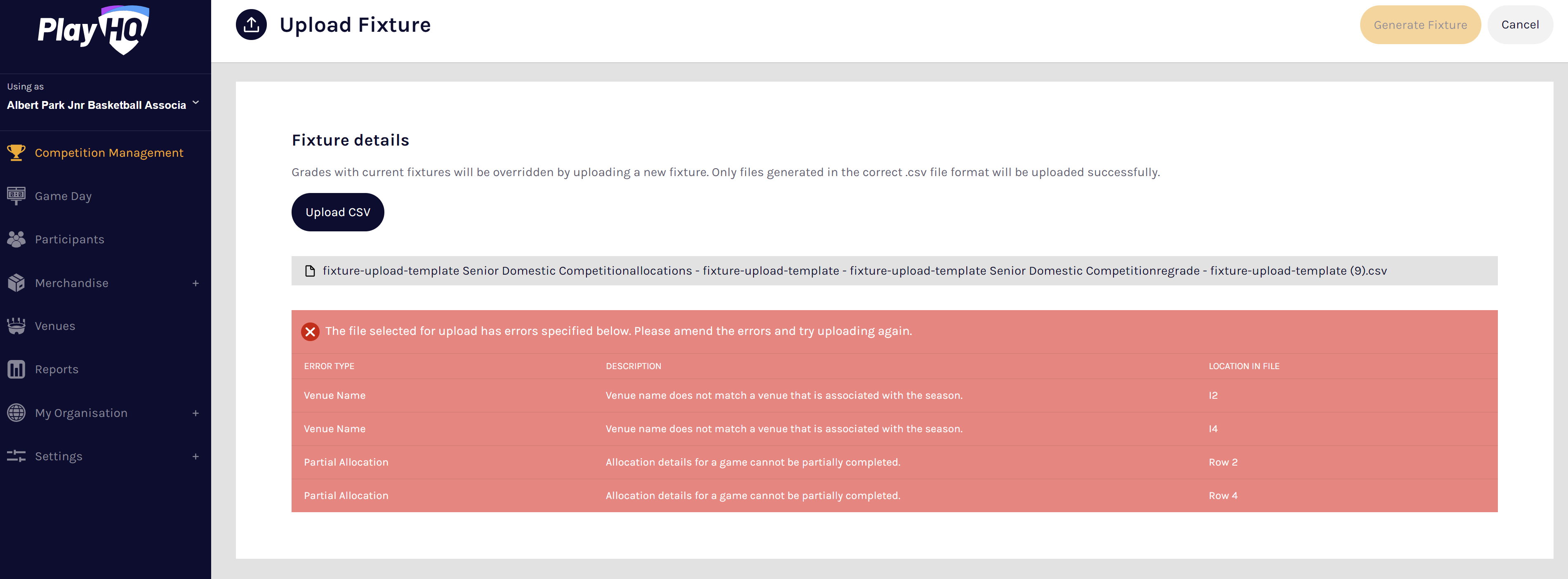 In the above file, in cells I2 and I4, the venue name and court did not match the venue that was associated with the season.  In addition Row 2 and Row 4's game allocation details were only partially completed.  Therefore as part of the validation, the system will display errors and they should be corrected and the file uploaded again.