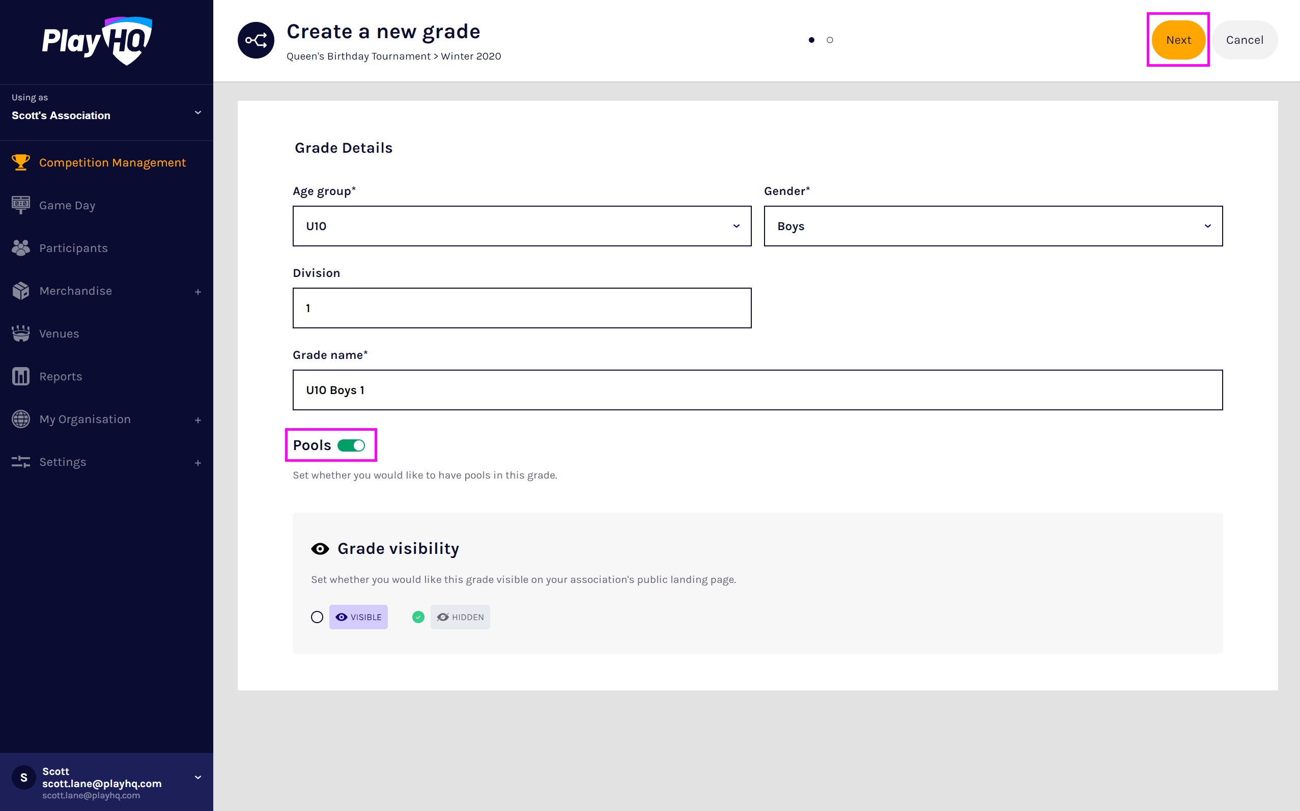 To enable pools for a new grade, create a tournament-style competition and season, then create a new grade in the season and enable the Pools option: