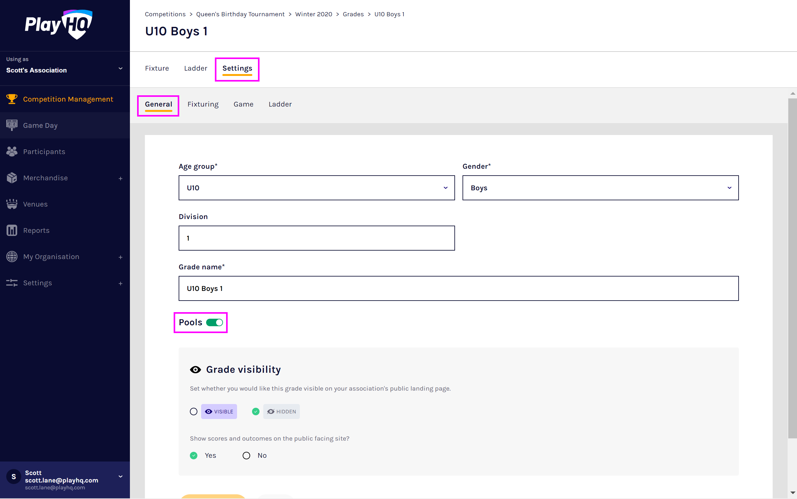 If you no longer want to use pools for a grade, you can disable pools by navigating to the grade's Settings tab, then selecting the General sub-tab, and disabling the Pools option, finishing with selecting Update & Save: