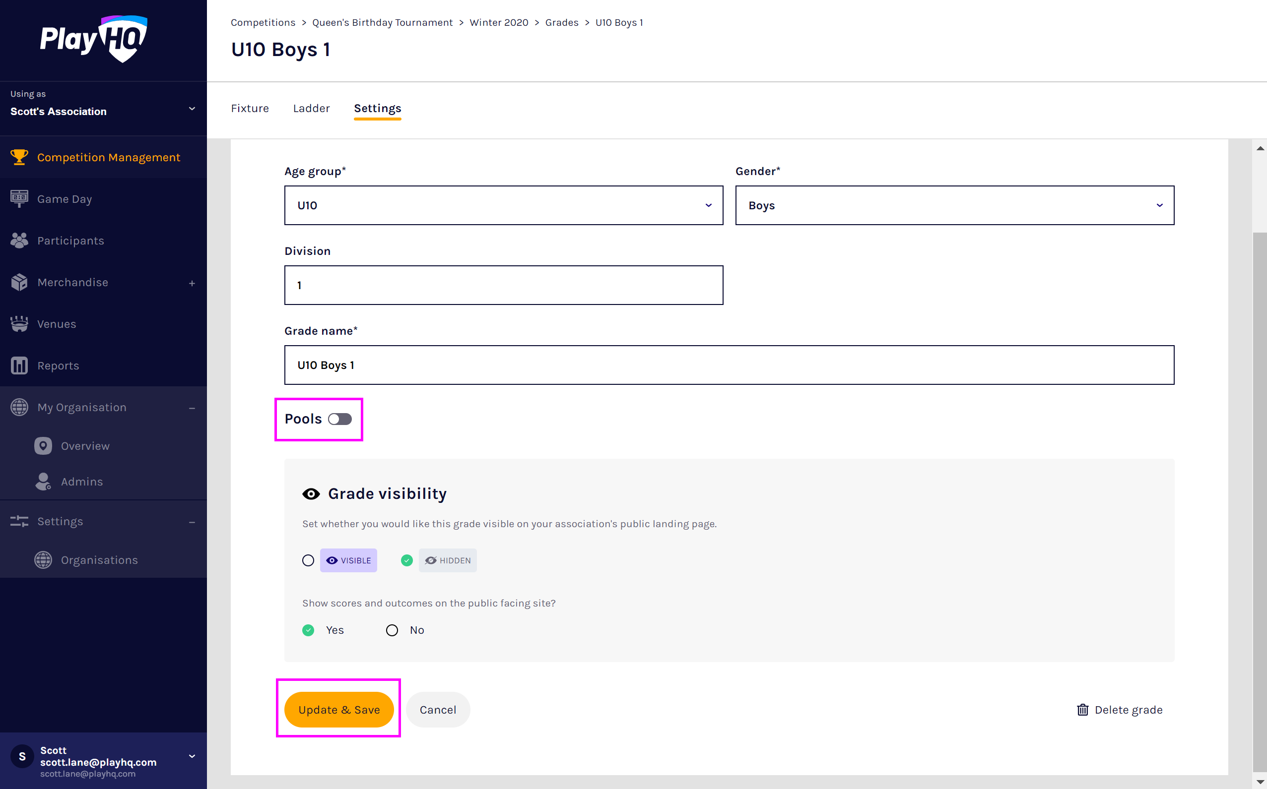 Pools can be enabled for an existing grade in a tournament type of competition by selecting the grade name in the grade list, navigating to the grade's Settings tab, then selecting the General sub-tab, and enabling the Pools option, finishing with selecting Update & Save: