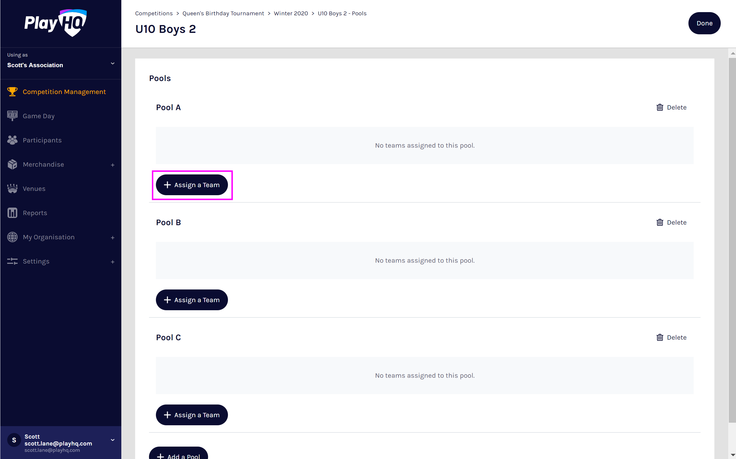 To assign a team to a pool, first allocate the team to the grade as described in Allocating teams to grades. Once a team has been allocated, navigate to the grade's pools page then select the relevant Pool Assign a Team button: