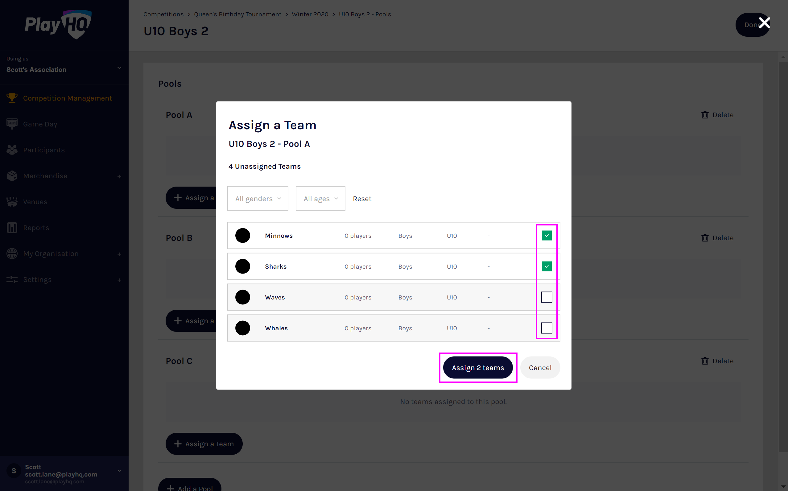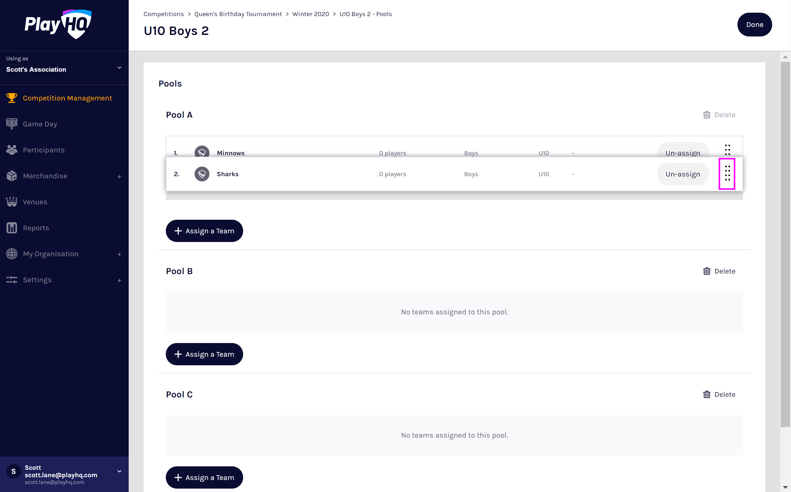 Note: Teams can only be assigned to pools that have not been fixtured. To assign a team to the pool after a fixture has been generated, first remove the grade's fixture, then assign the team to the pool, and re-generate the grade's fixture.