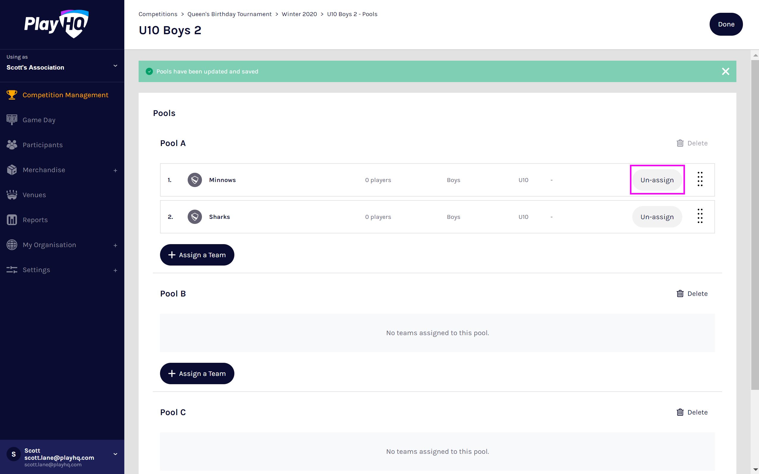 To unassign a team from a pool, navigate to the grade's pools page and select Un-assign: