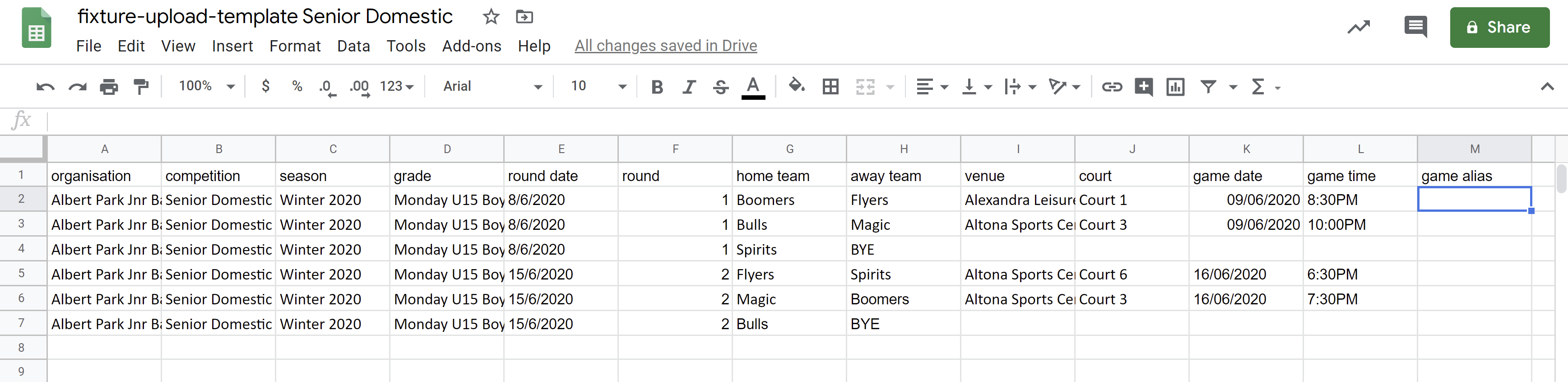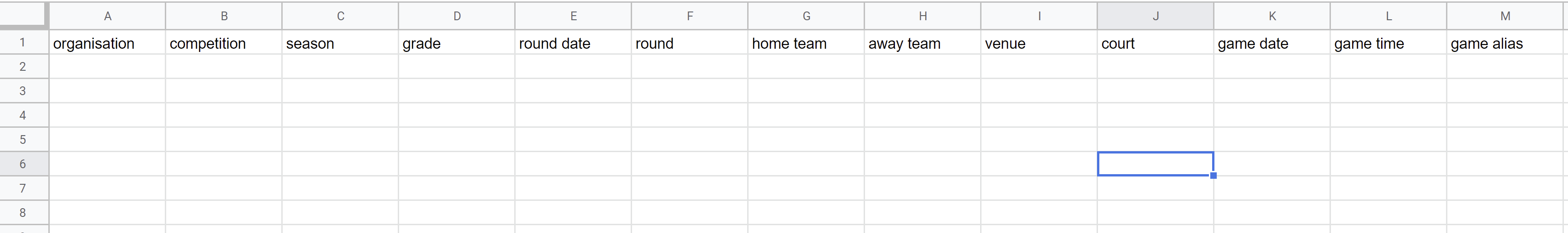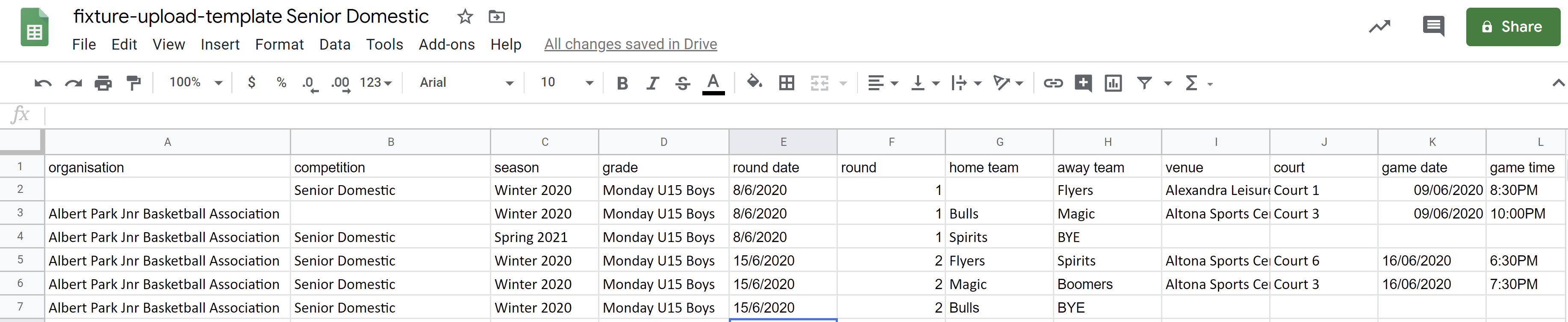 Download the CSV Fixture template and populate it with your fixture details. The template includes the correct column names that are expected when completing a fixture upload: