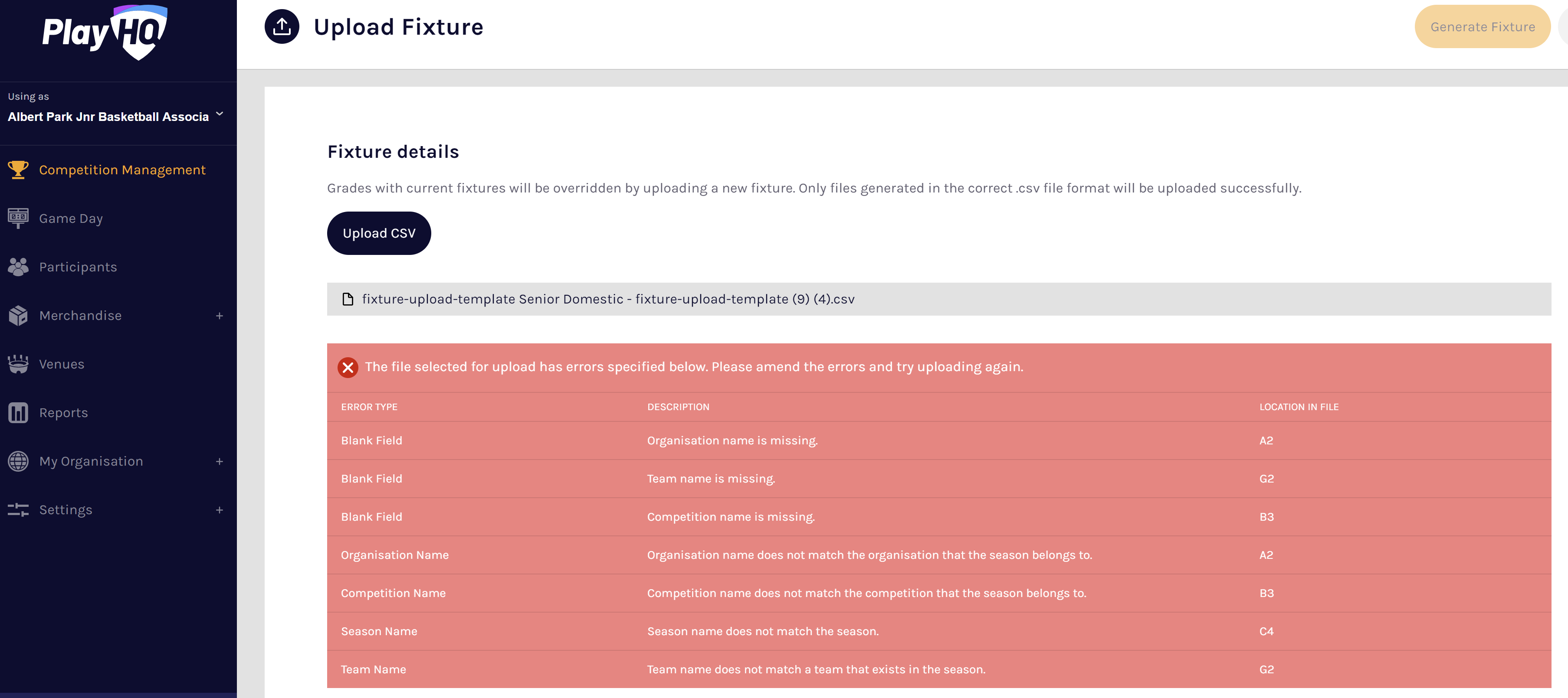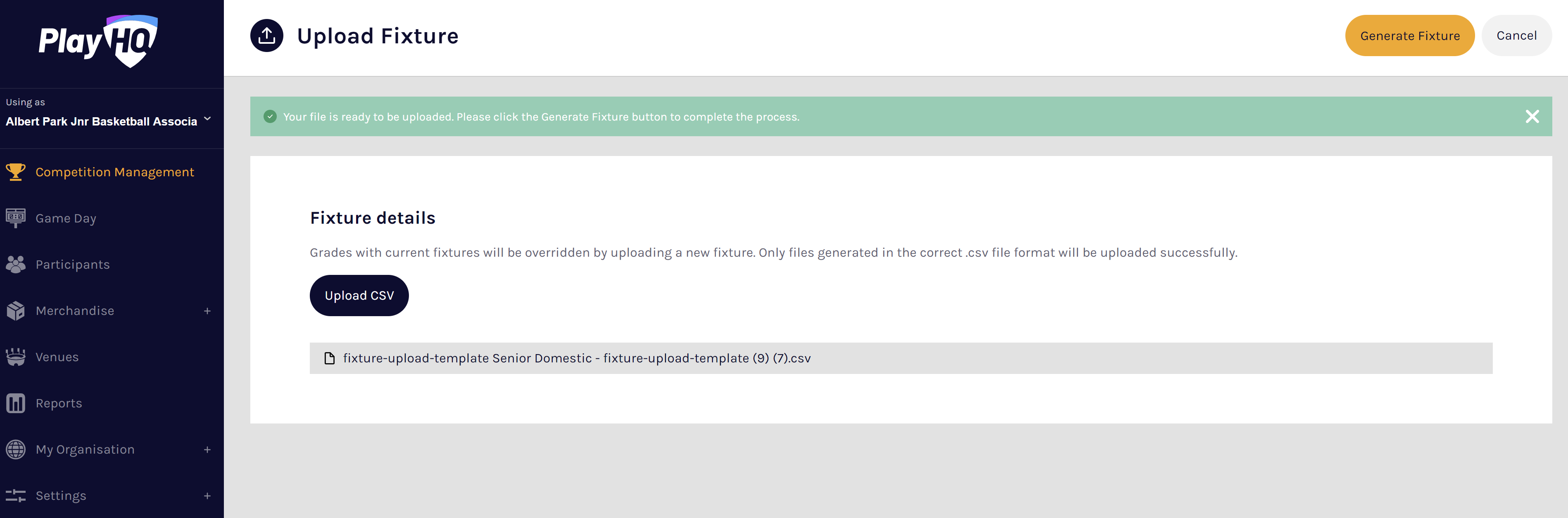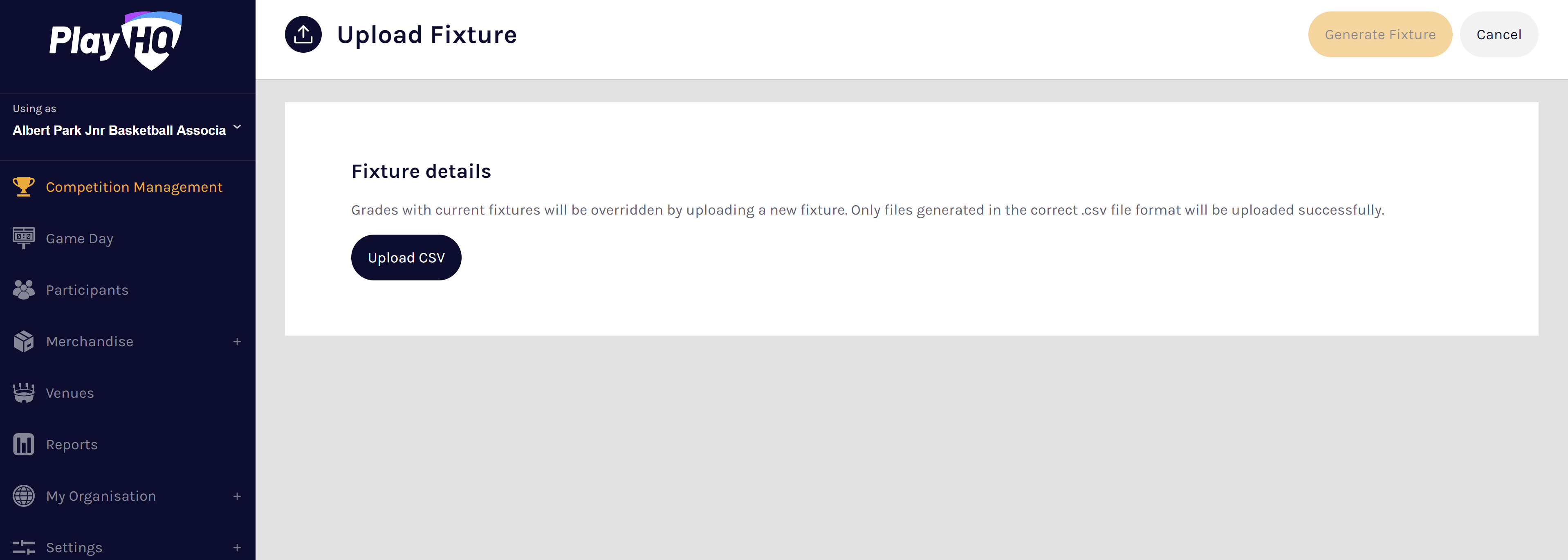 Note: The Fixture upload feature is disabled for Tournament style competitions due to the added complexity of this style of play. Additionally, if you use the fixture upload feature, the PlayHQ Regrade wizard will be disabled for the corresponding competition season. Regrading is then accomplished via the fixture upload.