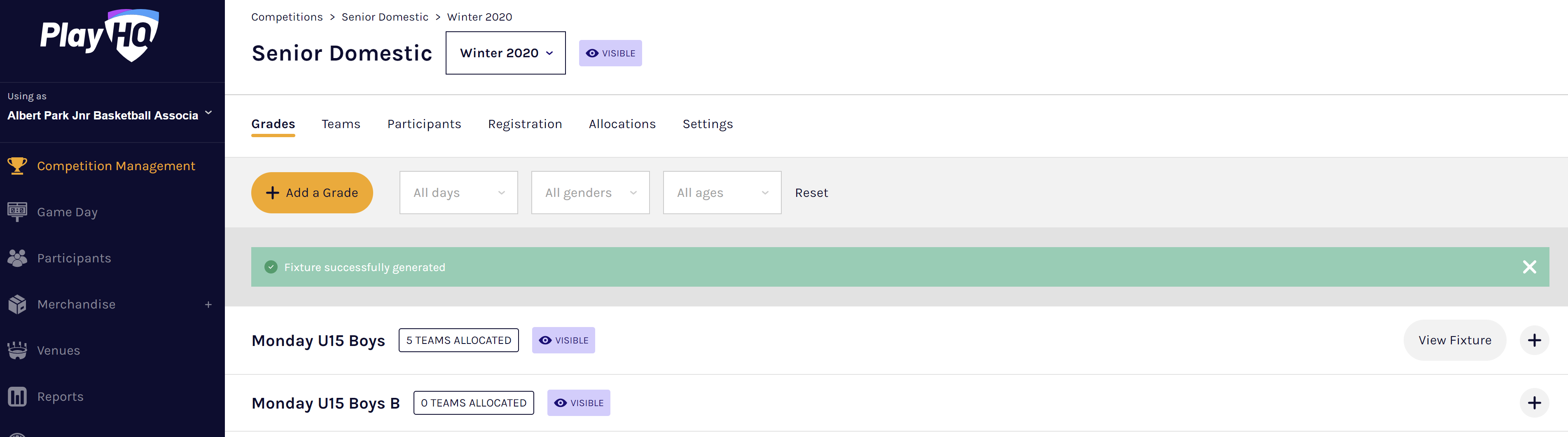 • A minimum of two Teams have been added or registered to the season (they can be allocated to a grade or left unallocated) otherwise, the feature will be disabled.