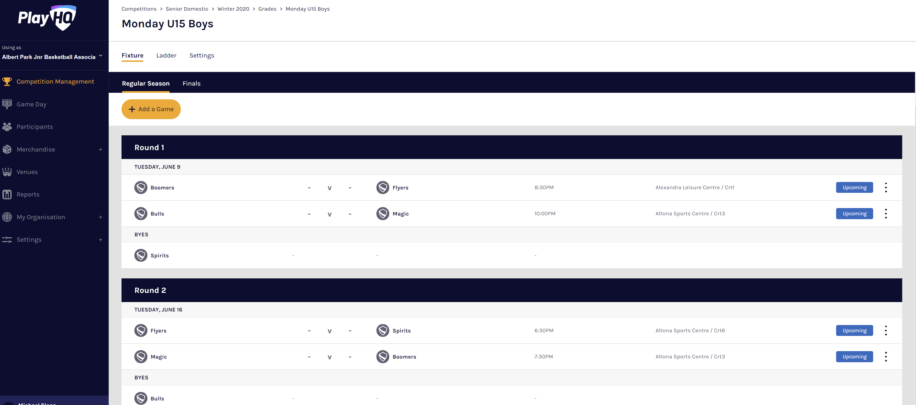 From the grade list, select the 'View Fixture' button for a grade impacted by the fixture upload. The system will match the fixture upload file. ie. Boomers are playing the Flyers in Round 1 on Tuesday the 9th of June at 8.30 PM on Court 1 at the Alexandra Leisure Centre.