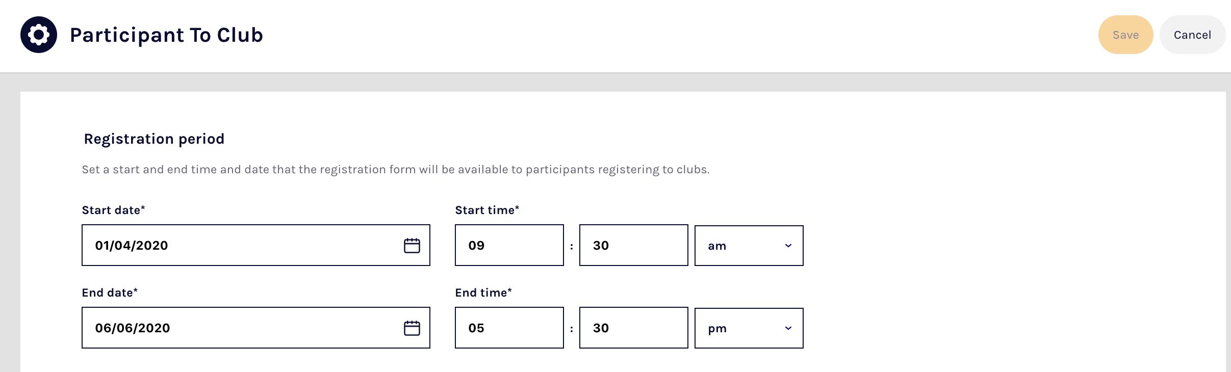 | 1 | Registration period | Set a start and end date/time that the registration form will be active (open to be used for registration). If a participant accesses the registration form outside of this time frame, they will not be able to register. |