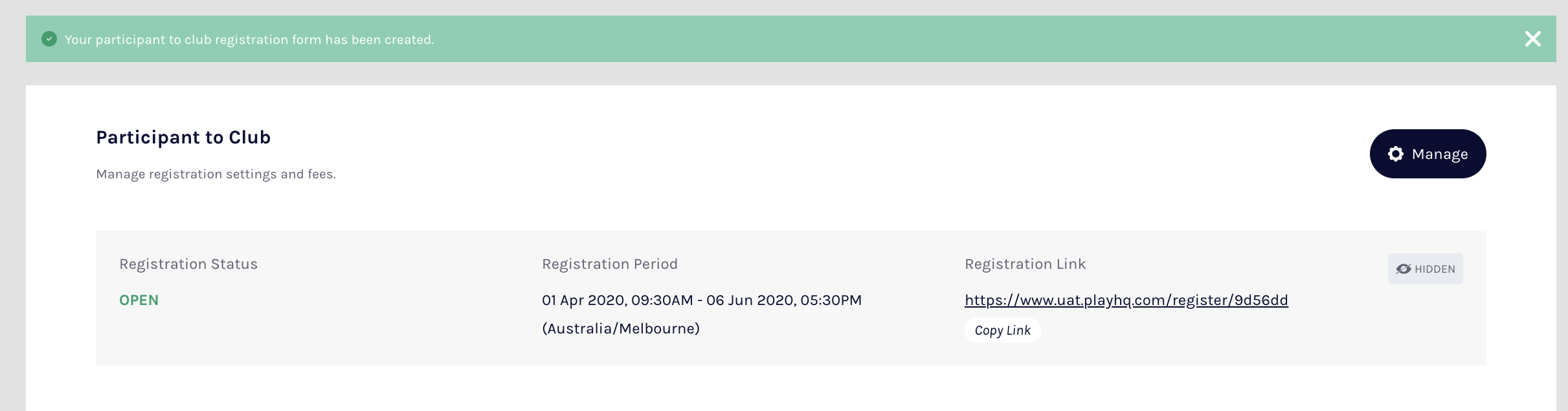 On successfully saving the registration form settings, the settings will display in a preview tile, and a unique registration link (URL) for the form is generated. This link can be shared with participants who would like to register directly to the Club for the season.