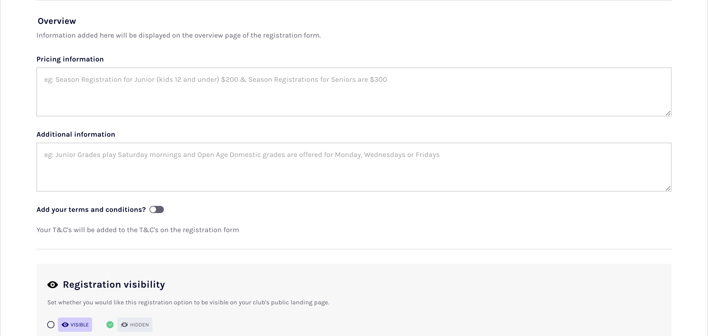 | 7 | Overview information | Information added here will be displayed on the overview page of the registration form. A 500 character limit applies to each of the 'Pricing information' and 'Addition information' fields. |