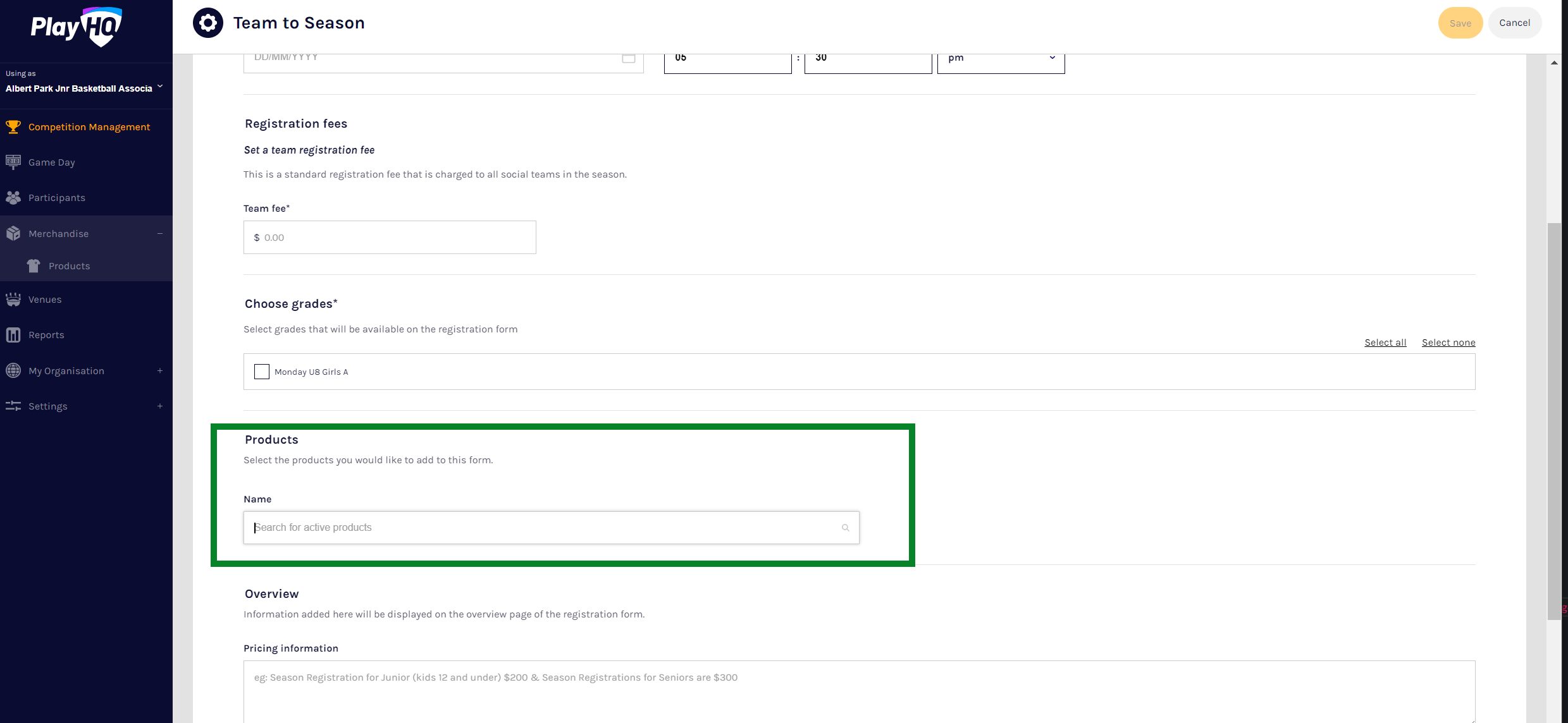 Once a product has been created, and has an Active status, it can be added to any registration form. Navigate to the Competition or Program Season, and select the Registration tab, and then Set up or Manage the applicable registration form.