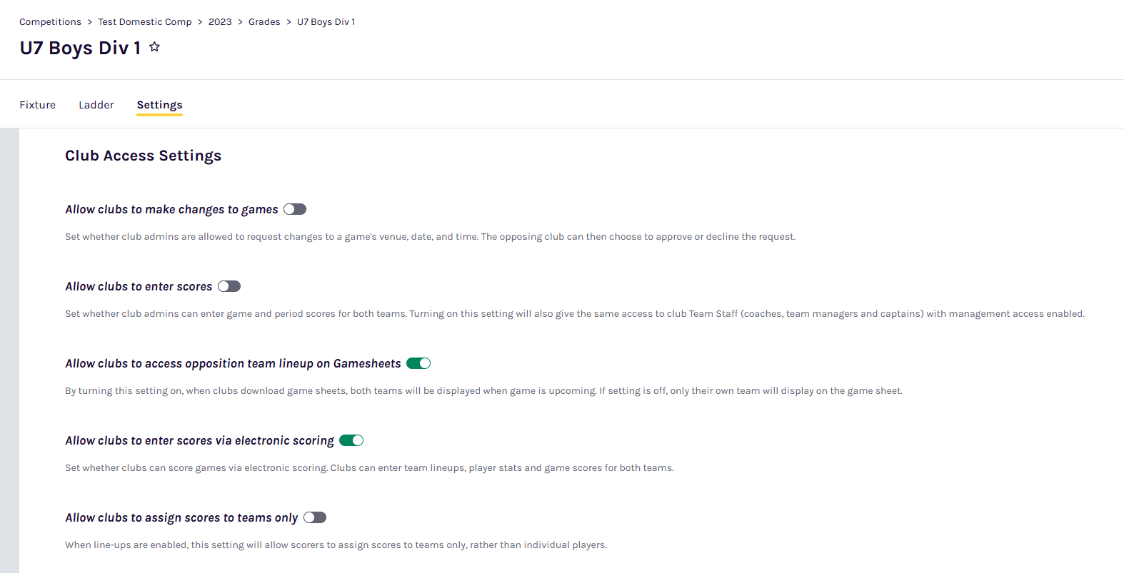 - Optional: Toggle 'Allow clubs to assign scores to teams only' if you want to restrict scoring to team totals without individual player statistics