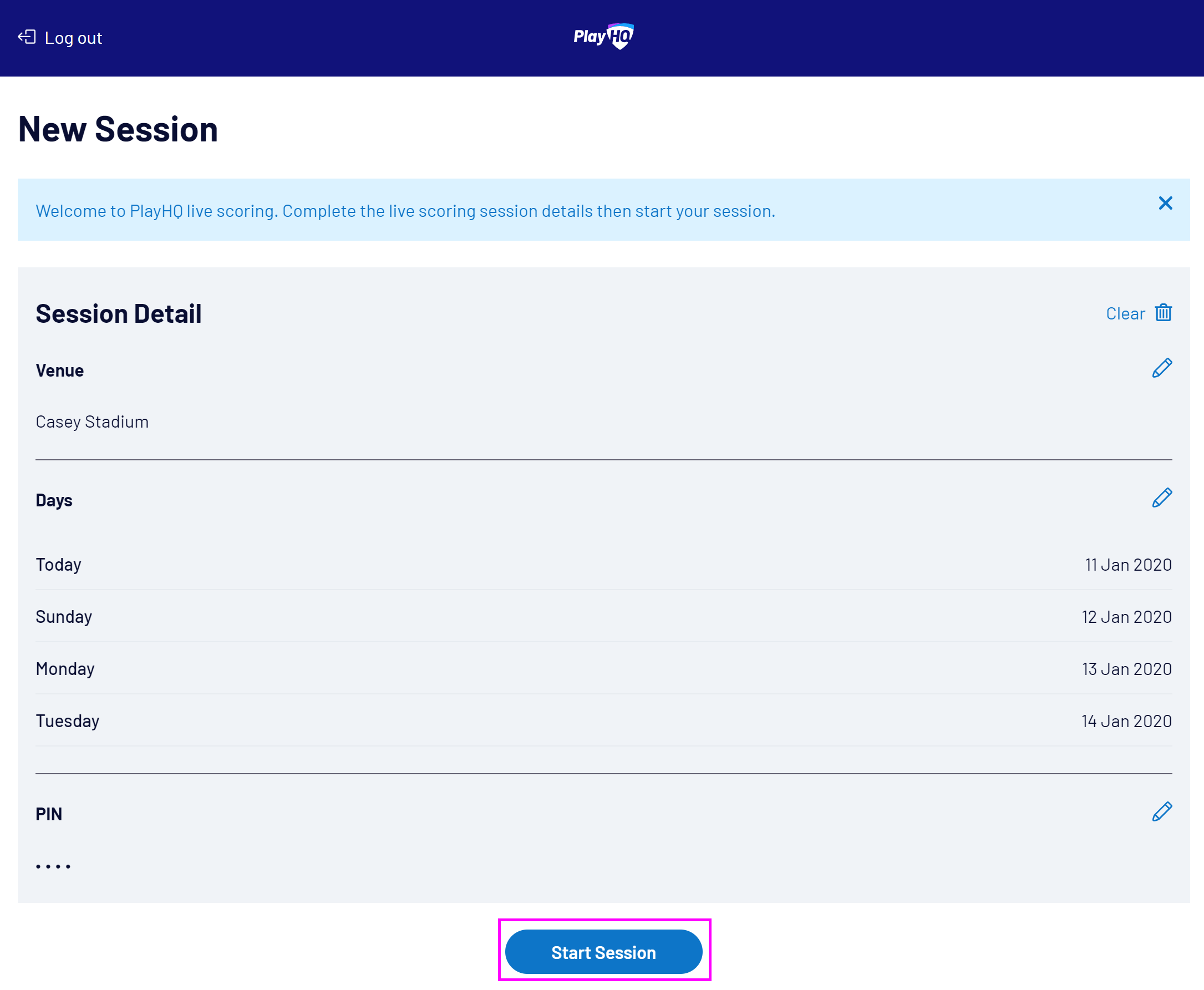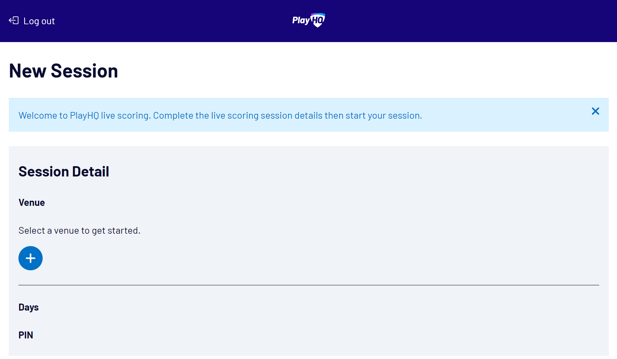 To set up an electronic scoring session, login to the PlayHQ electronic scoring application at https://score.playhq.com