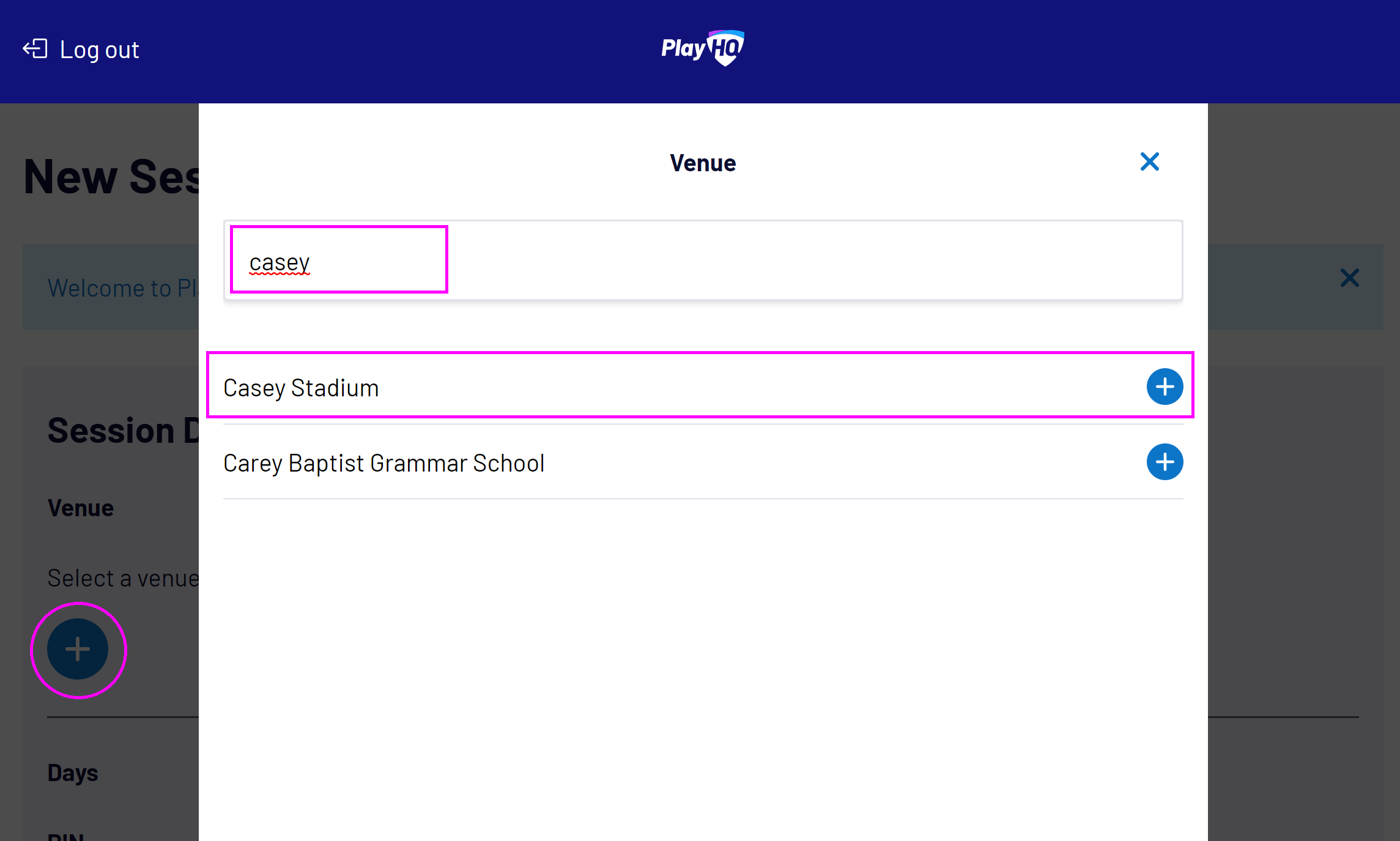 To select a venue, select the venue plus (+) button, type the venue name to find the venue, and then select the venue name or the corresponding plus (+) button: