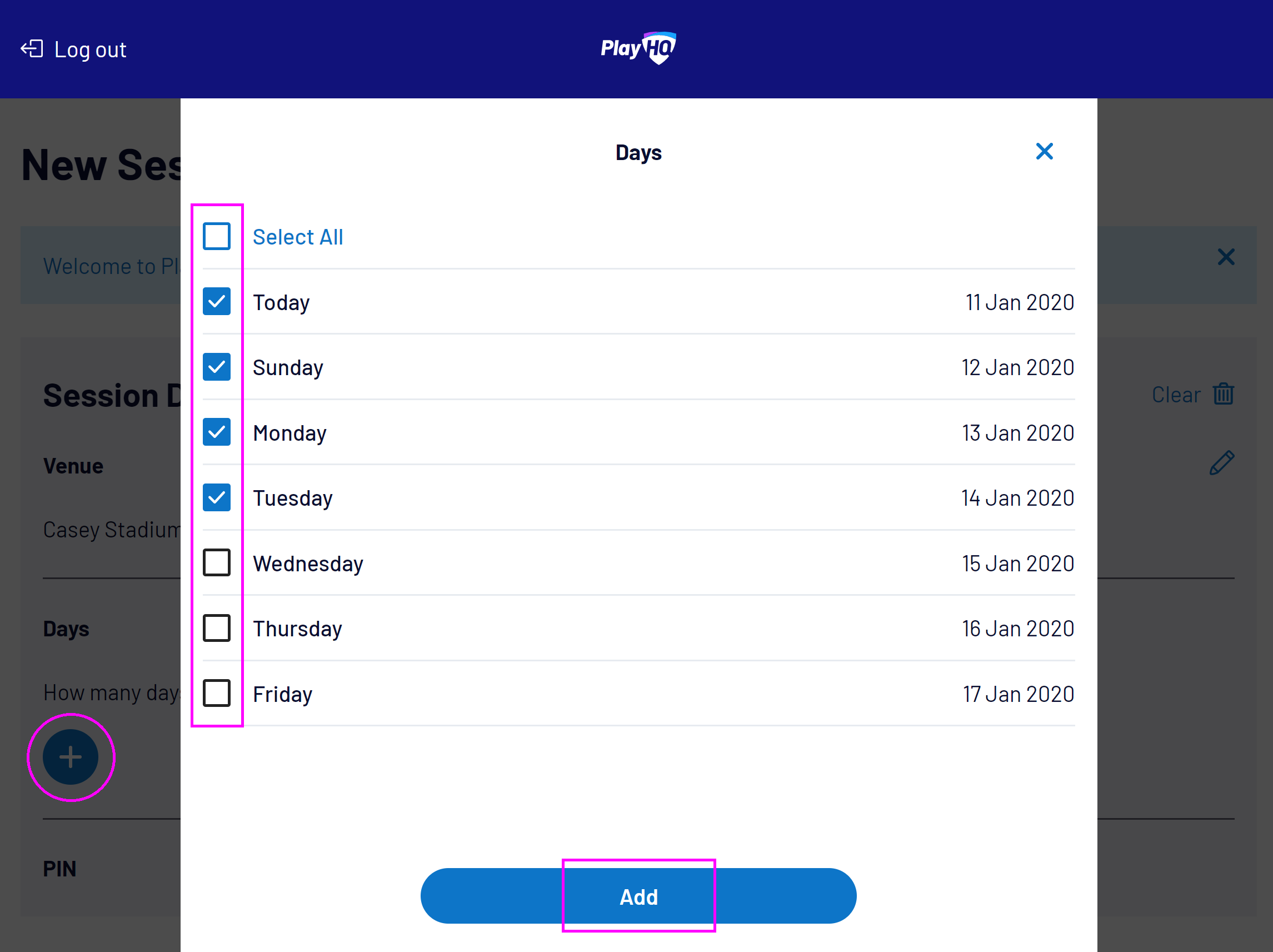 To select the days of games to download, use the plus (+) button to select one or more days then select Add. Up to 7 days in advance of the date you are setting up the session can be accessed: