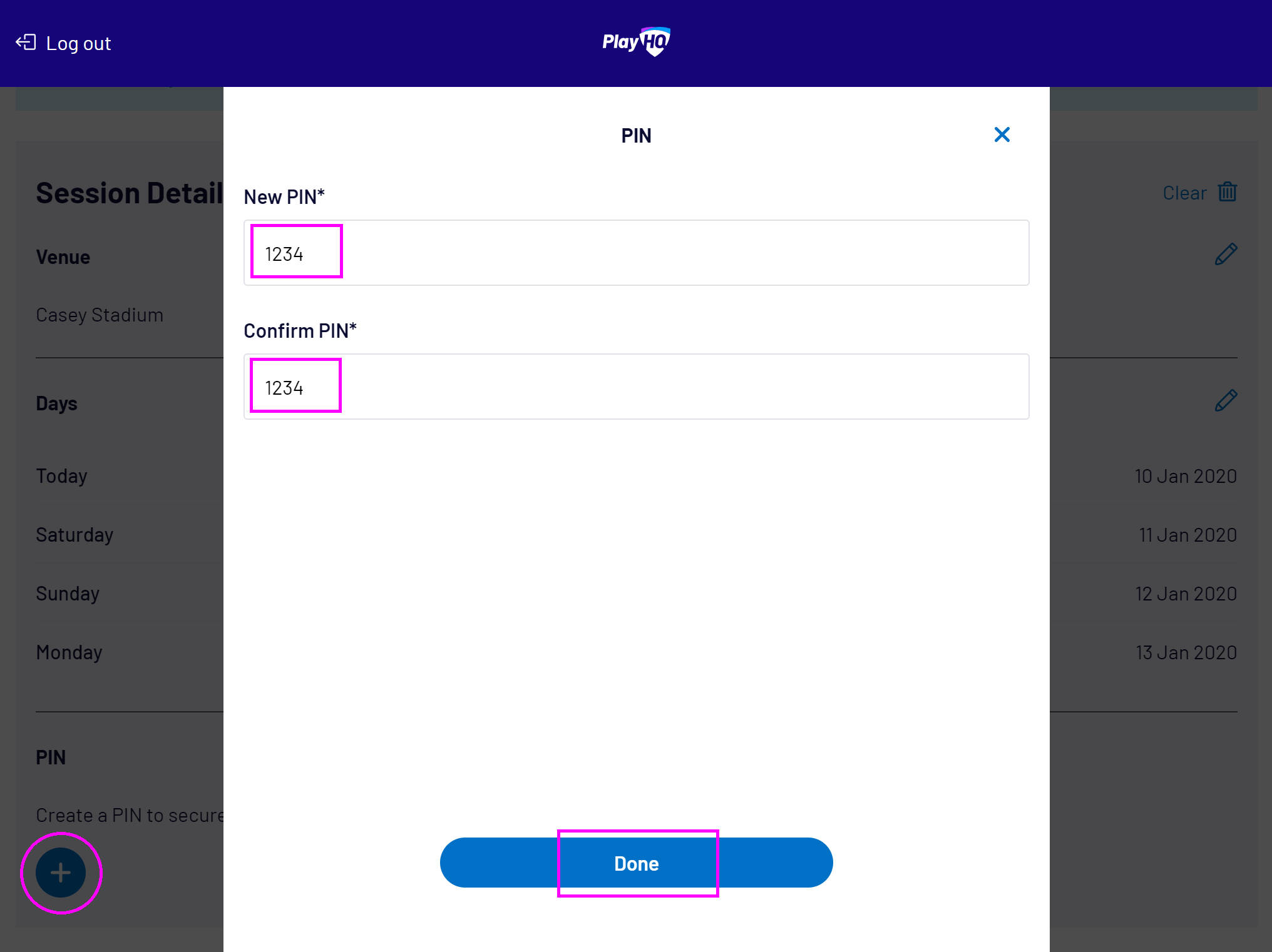 To set up a PIN, select the PIN plus (+) button, enter a 4 digit number PIN, confirm the PIN then select Done. The PIN is typically used by a game official to end/'sign off' an end-of-game result.