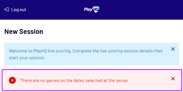 Games being played at the selected venue on the selected day/s will now be downloaded to the device. If no games are scheduled to be played at the venue on the selected day/s, an error message will be displayed:
