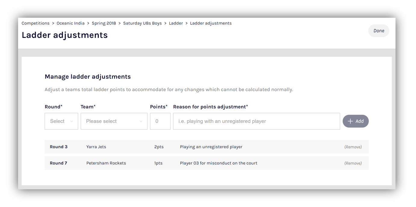 | Reason for points adjustment | This field contains the reasoning behind the adjustment. These details are not published on the PlayHQ Discover public site. Only administrators will be able to see the reason. |