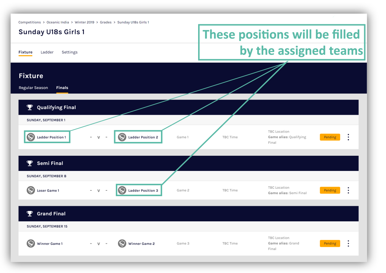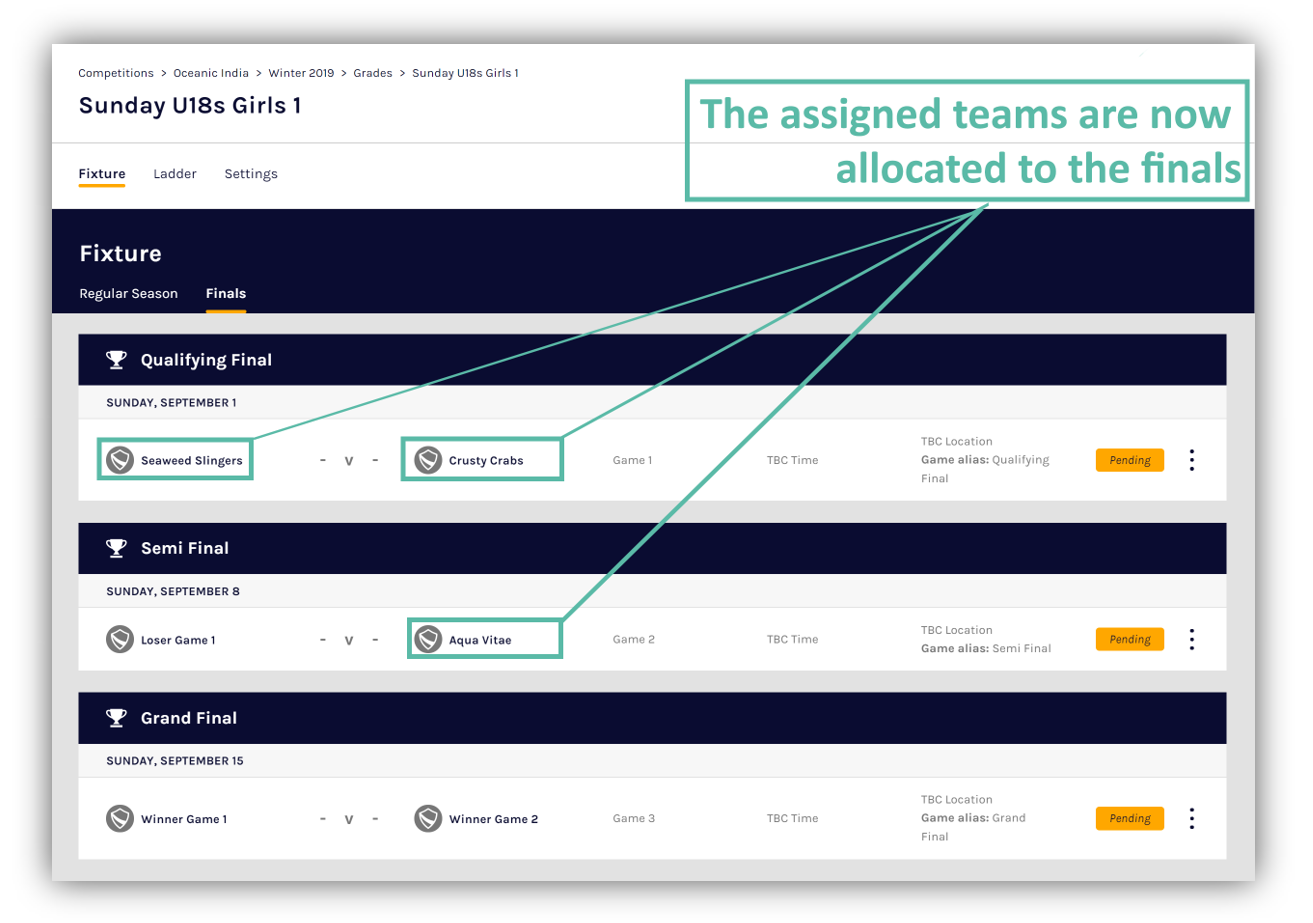 After assigning teams into finals, as game results/outcomes are entered for these games, the winning and losing teams will automatically be assigned to future games or eliminated based on the format of the finals selected.