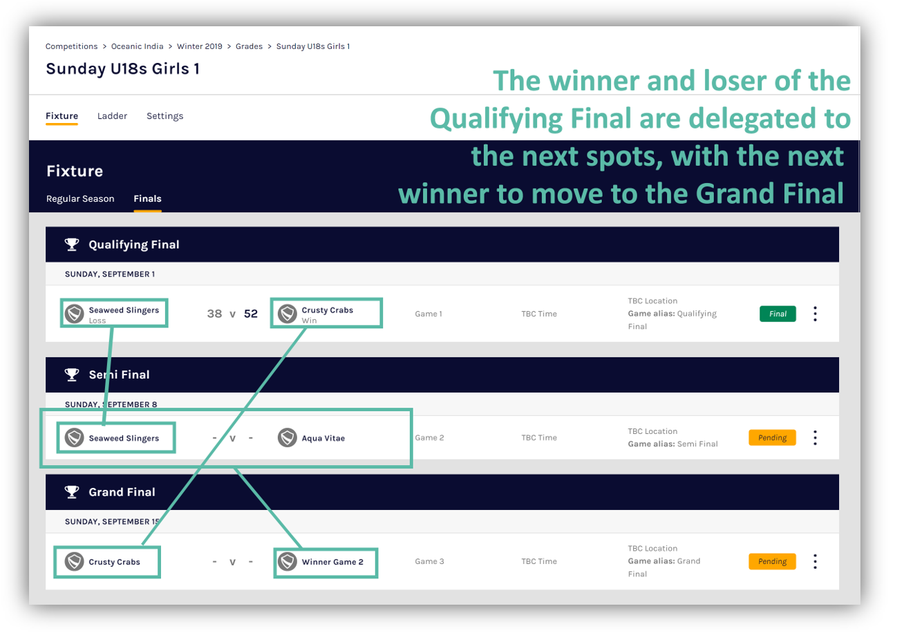 The example screen images below display how teams advance through to a grand final: