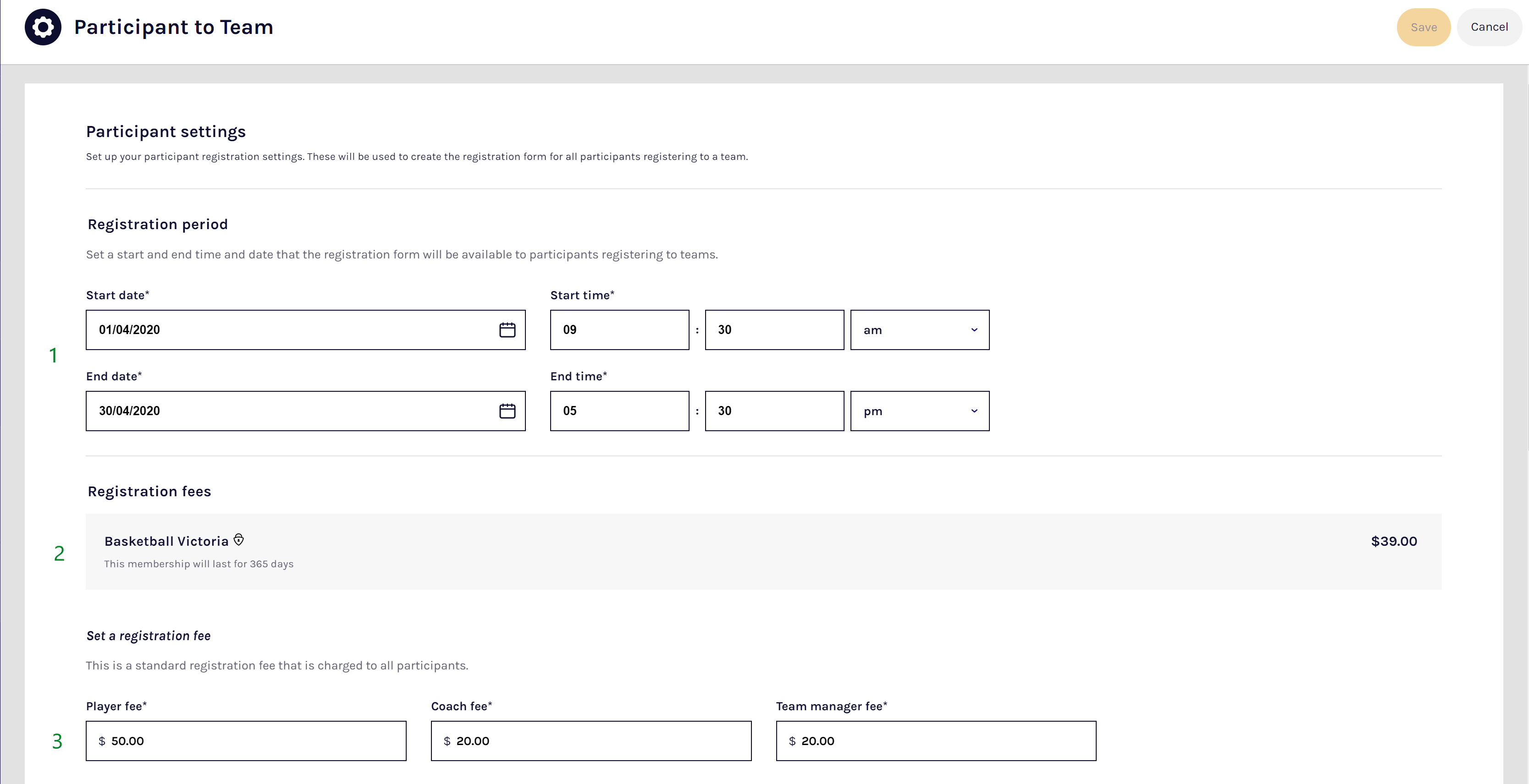 | 3 | Base registration fees | Set base your (standard) fees that participants will be charged to register for this season. A Player, Coach, and Team Manager can all be charged separate fees. The set fee should be $0.00 (if the registration will be free) or greater than $1.00 (if you wish to charge a registration fee). |
