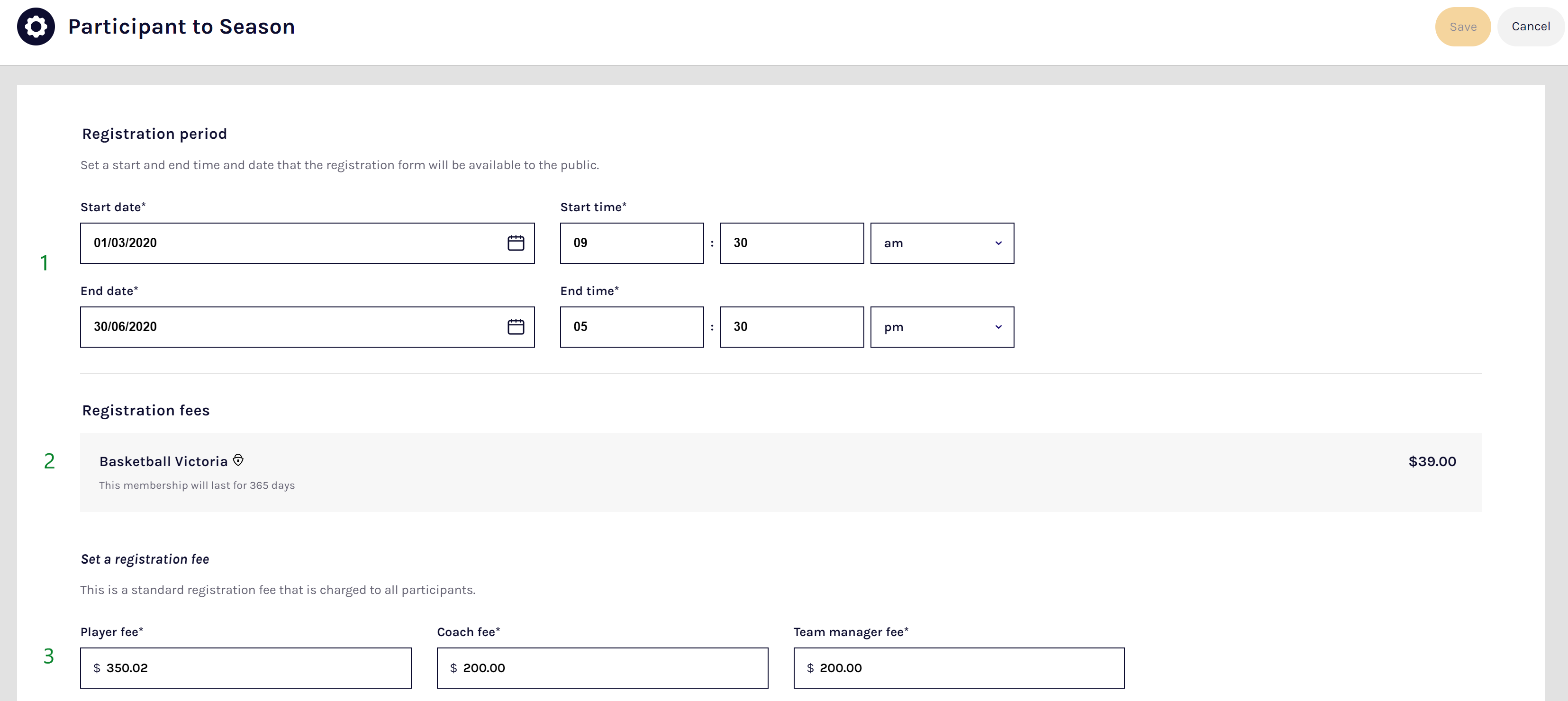 3 Base registration fees Set base your (standard) fees that participants will be charged to register for this season. A Player, Coach, and Team Manager can all be charged separate fees.