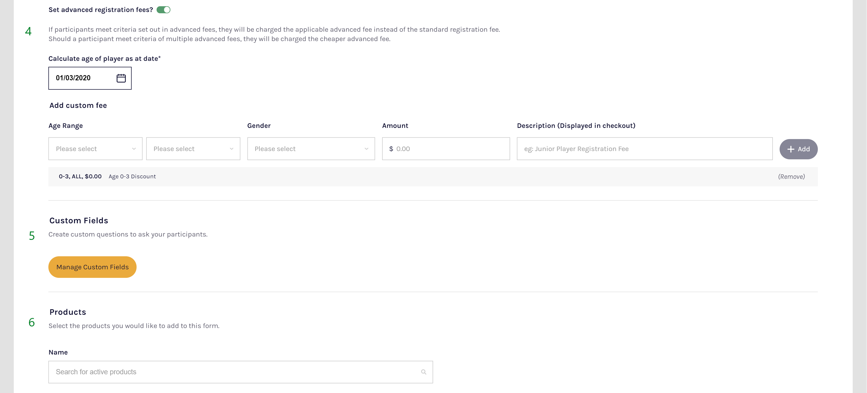 4 Advanced registration fees Advanced fees can only be set for Players (i.e. not Coaches or Team Managers). A specific amount (and description that will appear to the participant) can be set for any given age range and gender. A date to calculate the age of the participant must be set, as well, when using advanced fees. If the registering participant meets the criteria of an advanced fee, they will be charged the advanced fee instead of the standard fee. If they meet the criteria of multiple advanced fees, they are charged the cheapest corresponding fee.