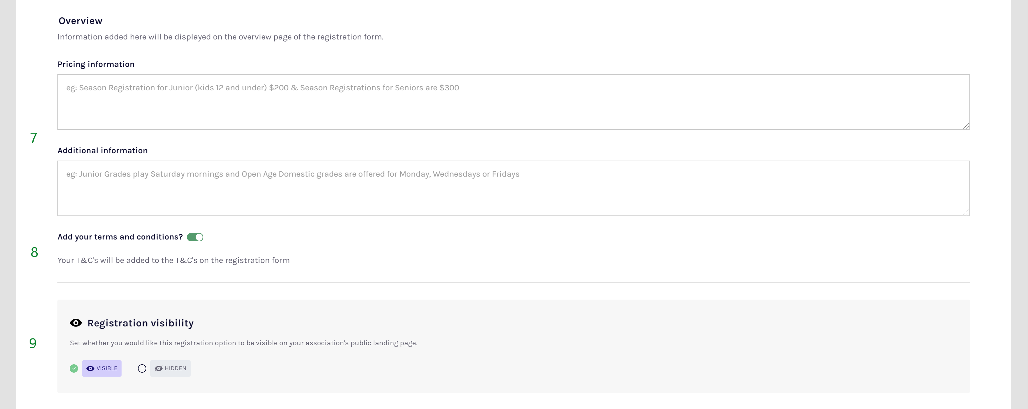 Information added here will be displayed on the overview page of the registration form. A 500 character limit applies to each of the 'Pricing information' and 'Addition information' fields.