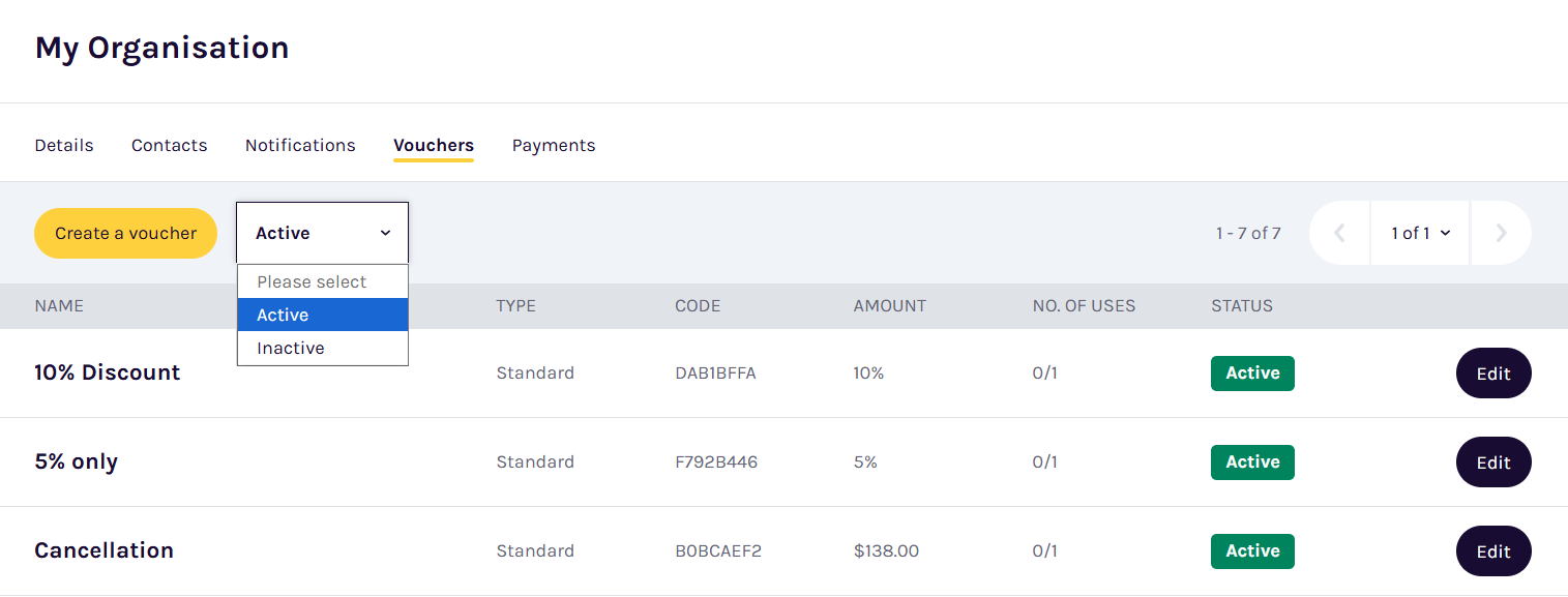 - Navigate to My Organisation > Overview > Vouchers tab