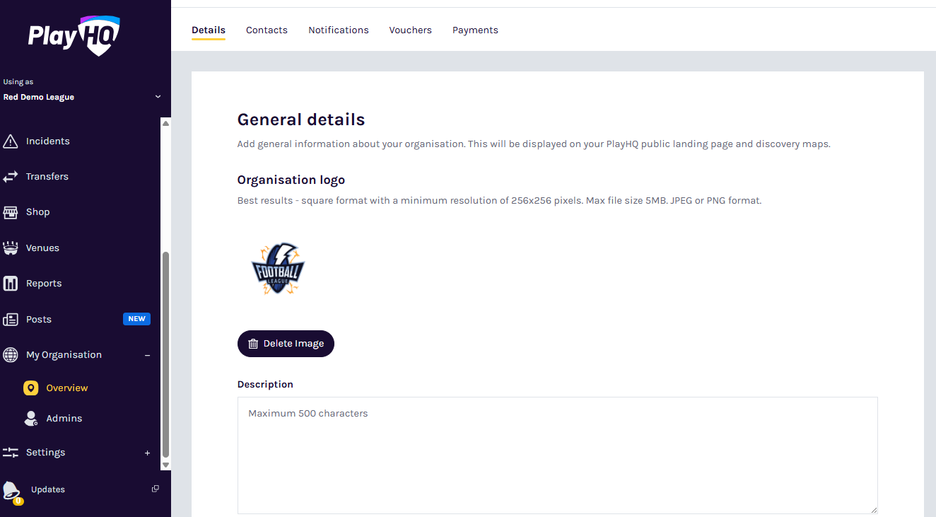 The My Organisation section in PlayHQ allows administrators to update key details about their organisation, including key contact information, visibility settings, and Terms and Conditions.