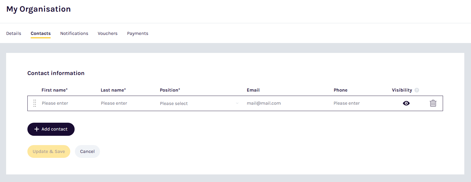 From the Admin Portal, click My Organisation > Overview > Contacts