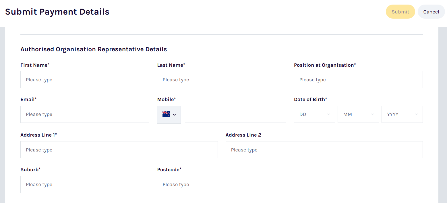 Ensure all information matches your official organisation documents exactly. Incorrect details will delay your payment setup.