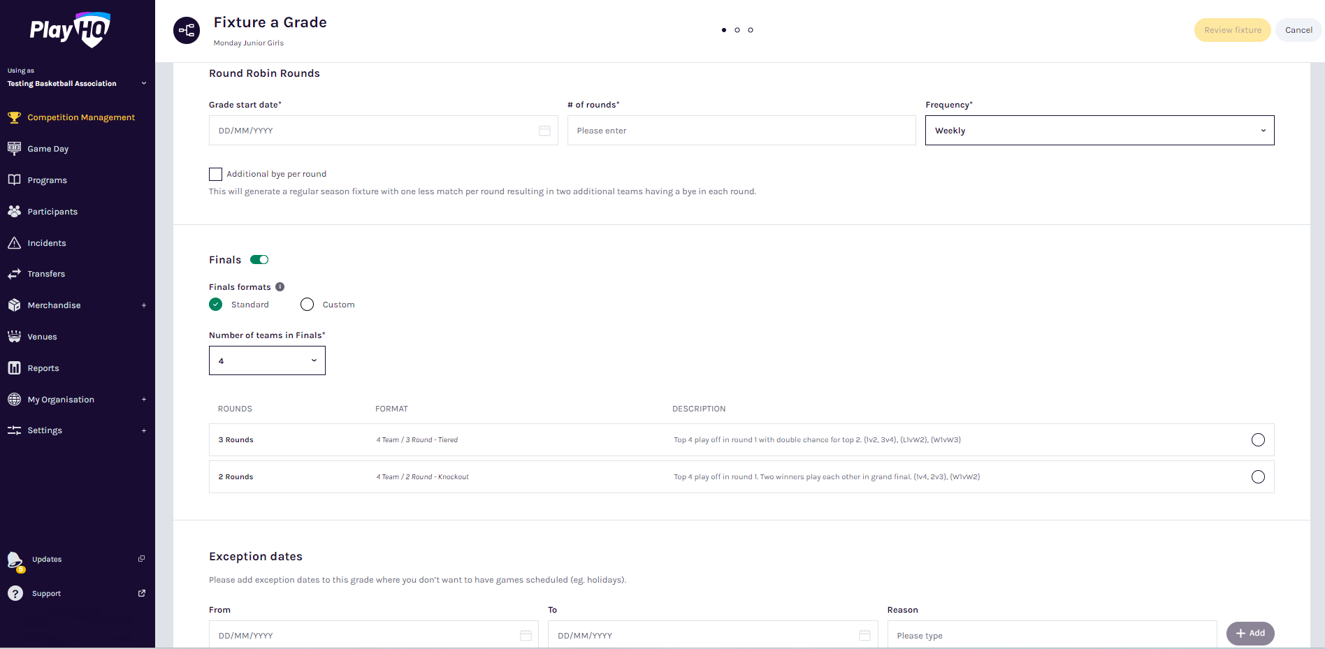 | 3 | Exception dates | Finally, set any exception dates for the grade - that is, days when the grade should not have any games. Exception dates created or updated at the season level will be visible and can be adopted or ignored by deselecting the Season setting tickbox. Read a detailed breakdown in the managing exception dates for a grade or season exception dates article. |