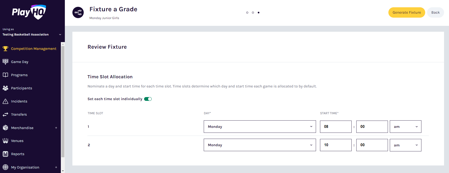 In order for PlayHQ to automatically allocate games to a day and time, admins need to select a day and start time for each time slot. There will be a time slot associated to each game within a round