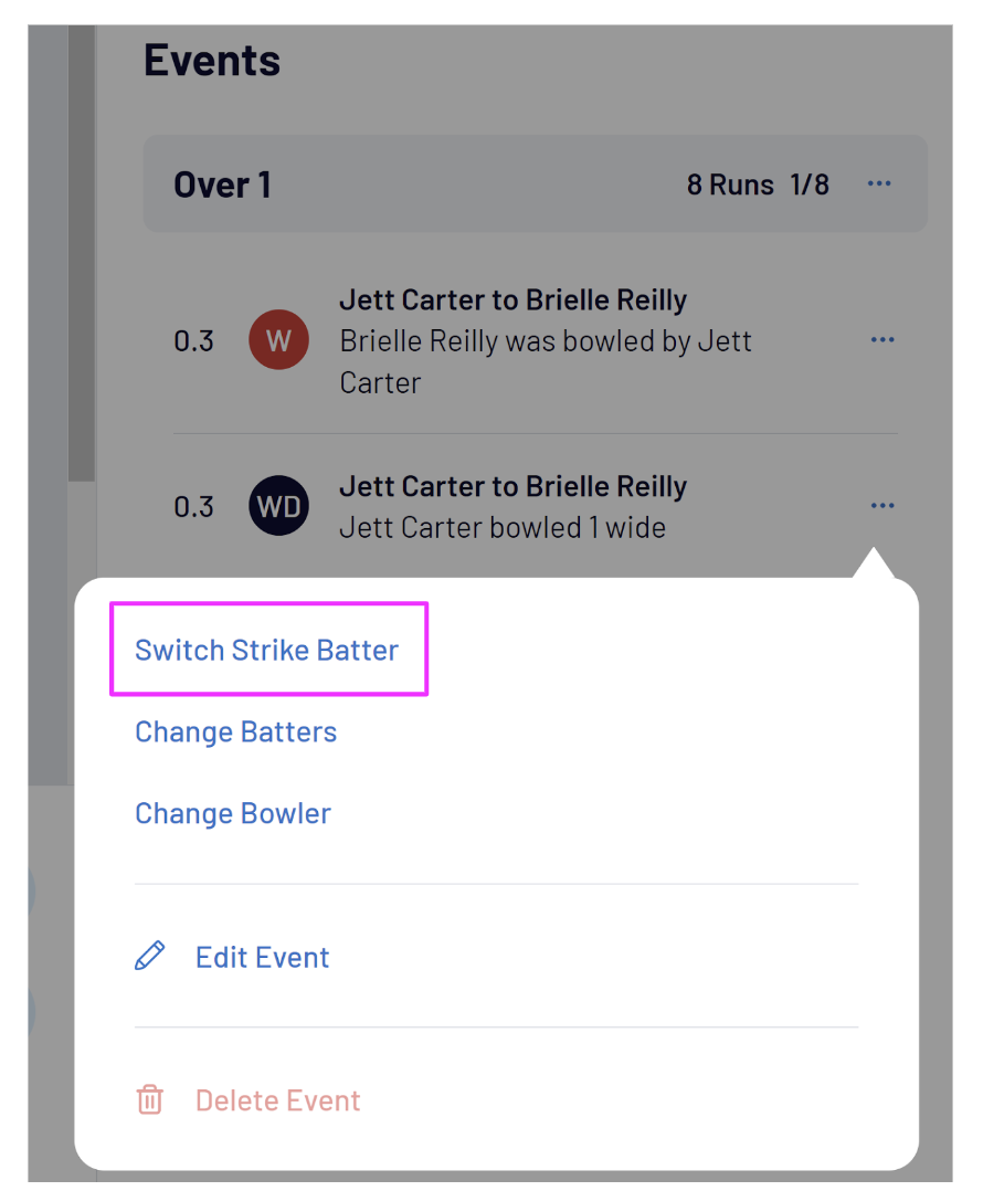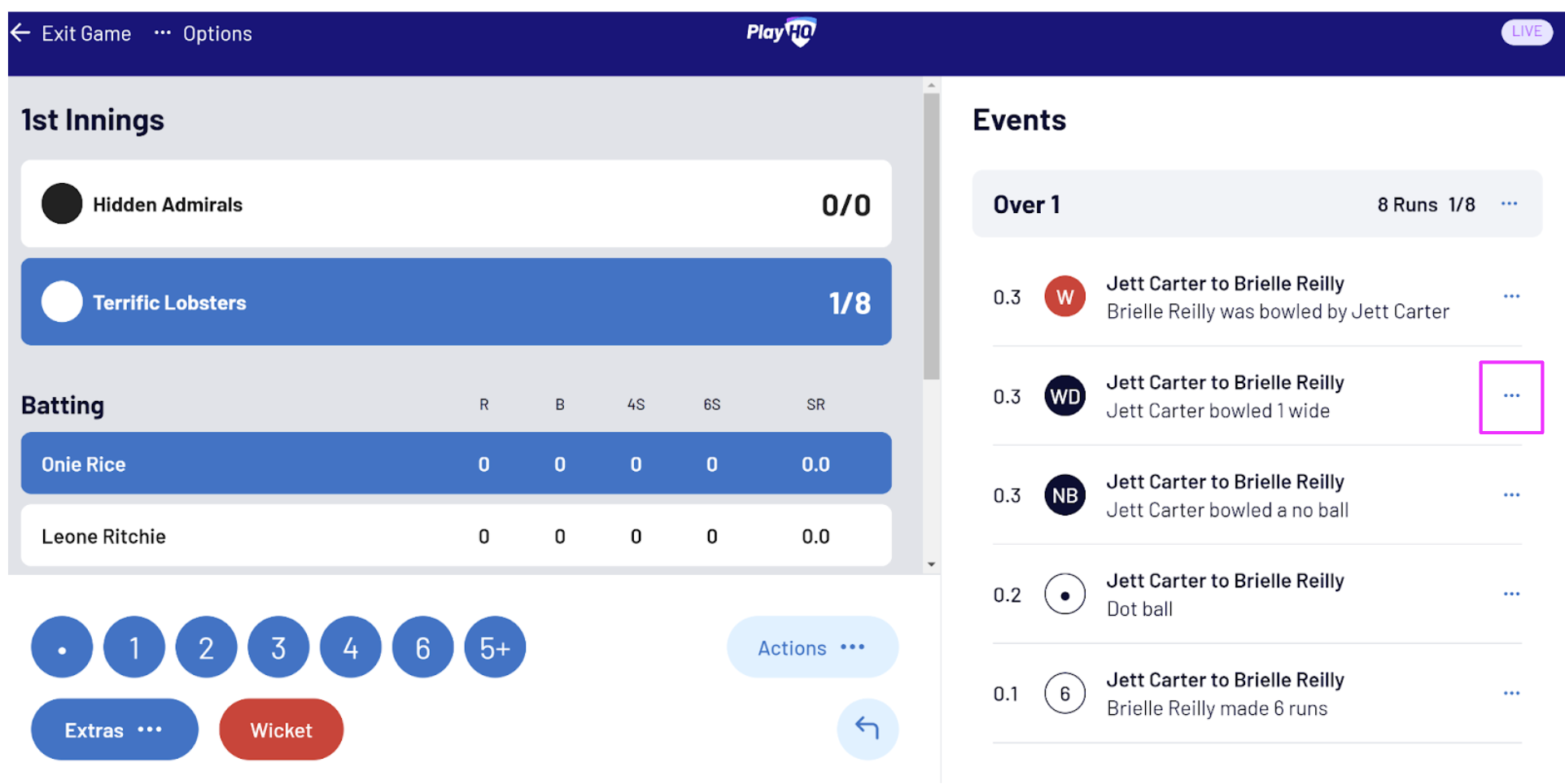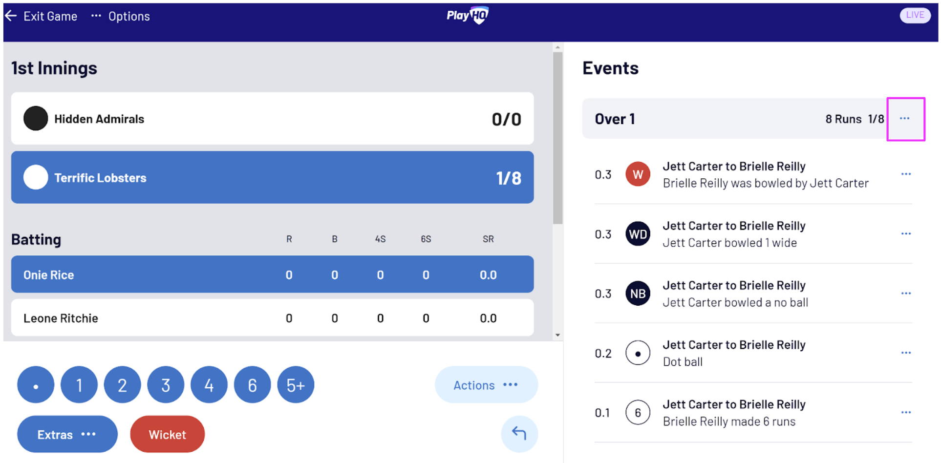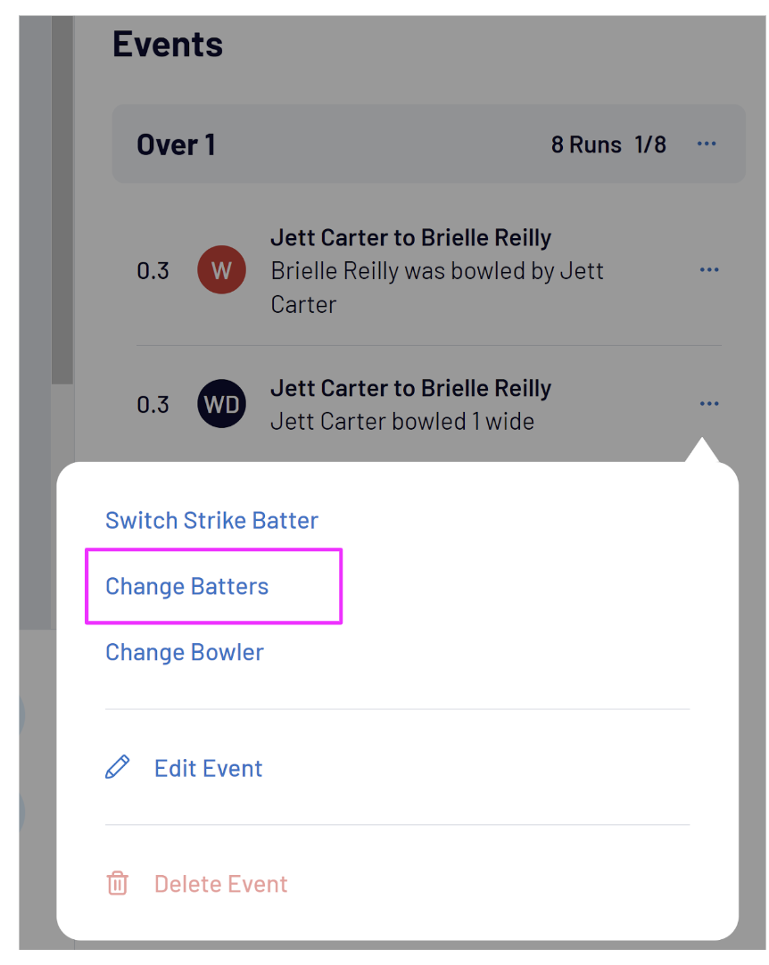 To change the batter for their entire innings, select the options icon next to any ball and select change batters