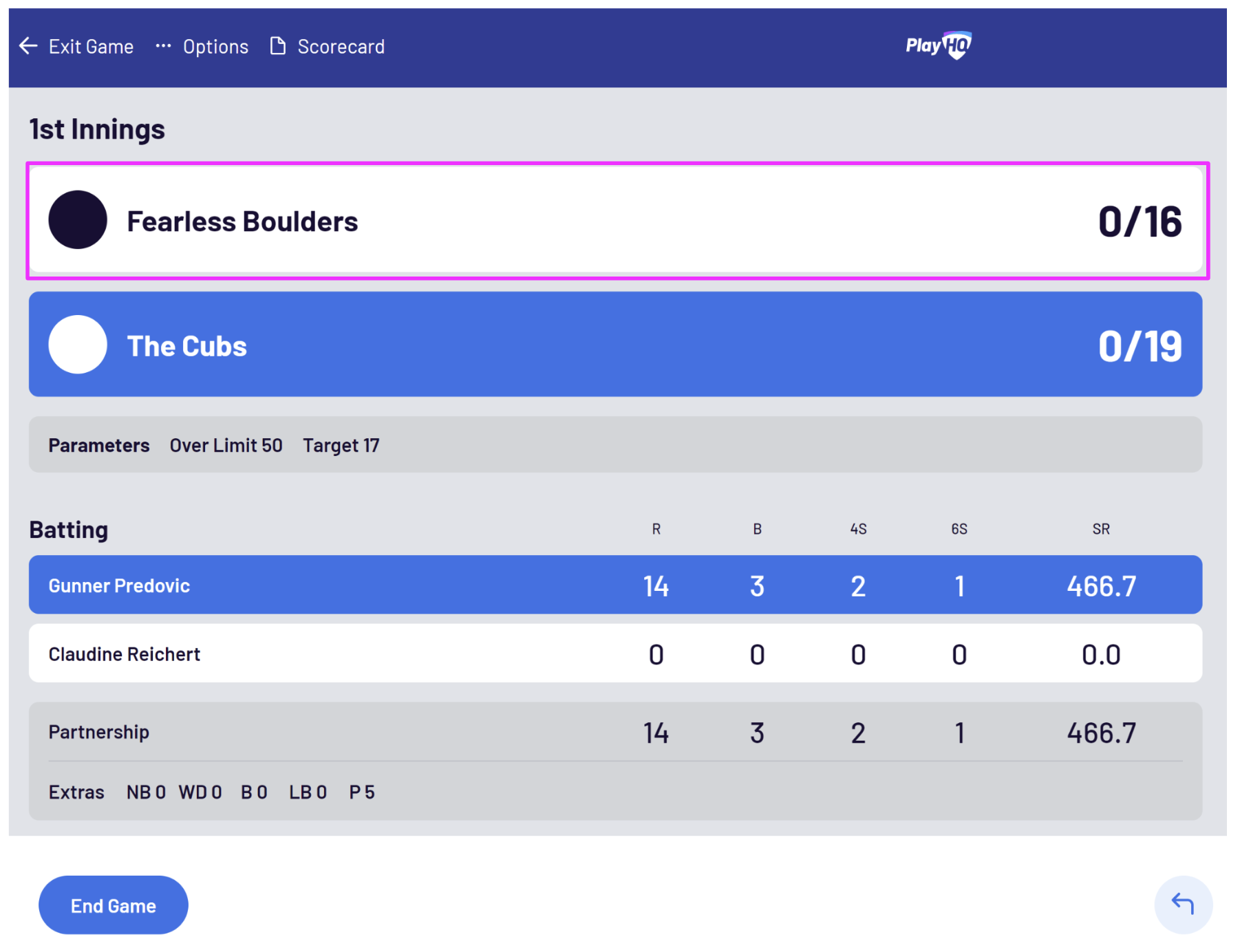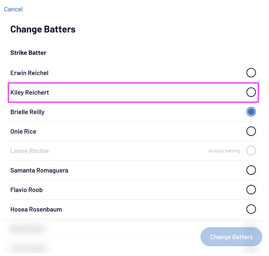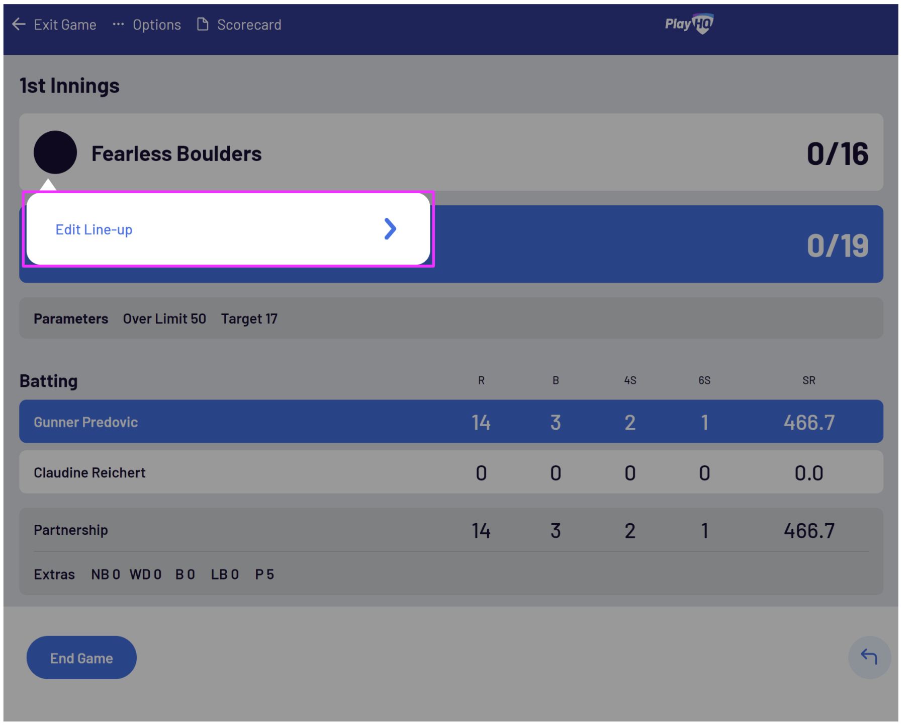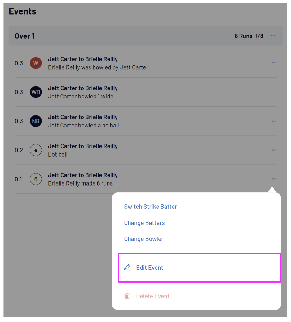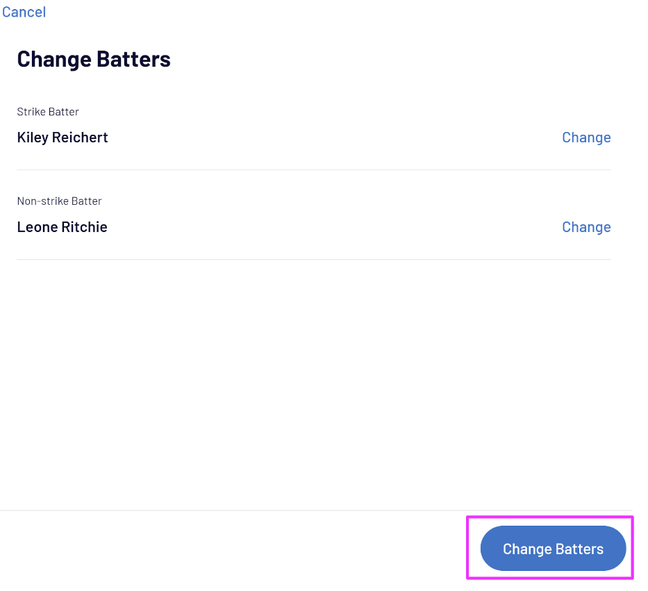 To change the batter for their entire innings, select the options icon next to any ball and select change batters