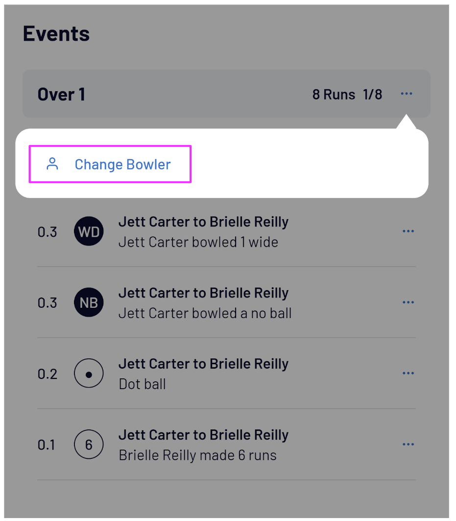 To change the bowler for a whole over, select the options icon next to the over you wish to change