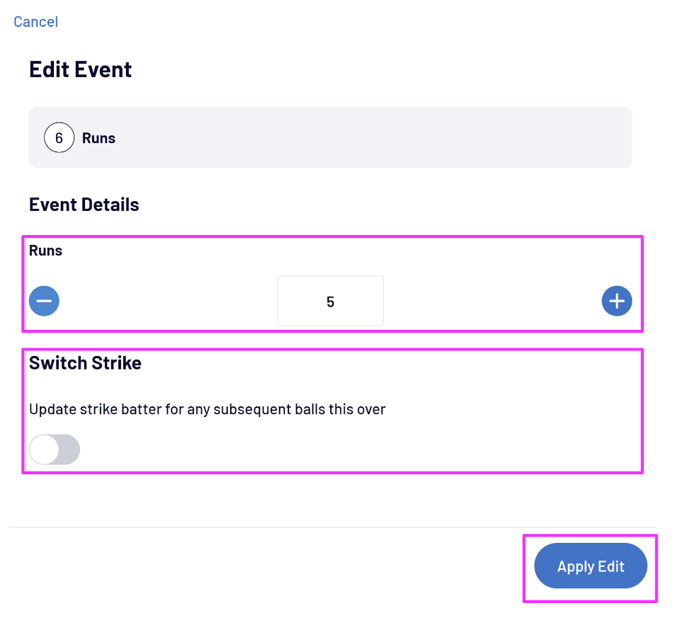 Update the value of the event & decide if you wish Update Strike Batter for subsequent balls this over (¤t strike batter) and select Apply Edit. If toggled on, all the batter statistics will update automatically